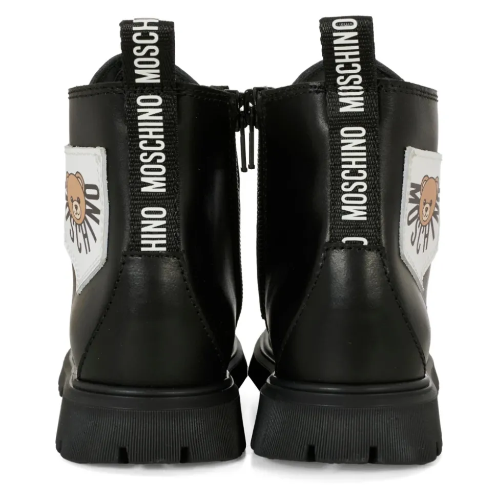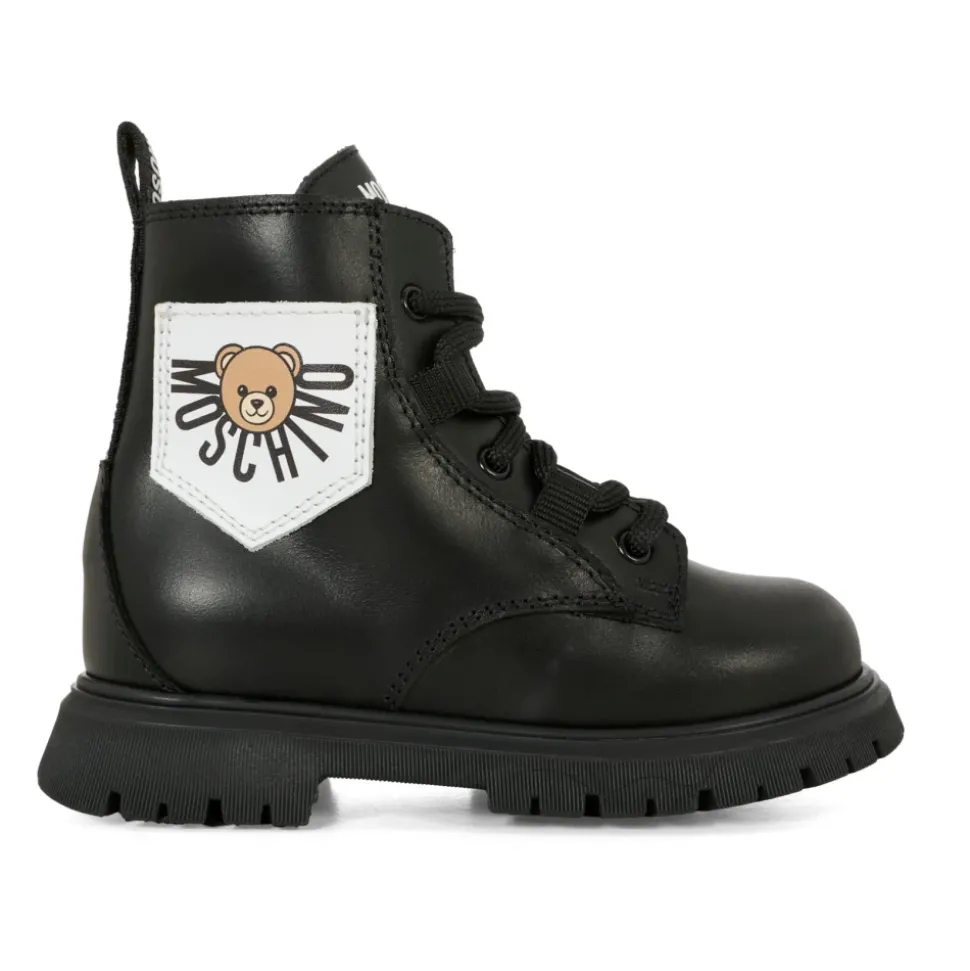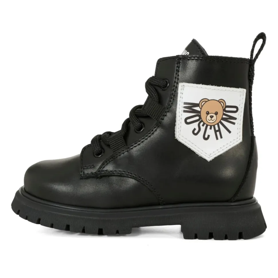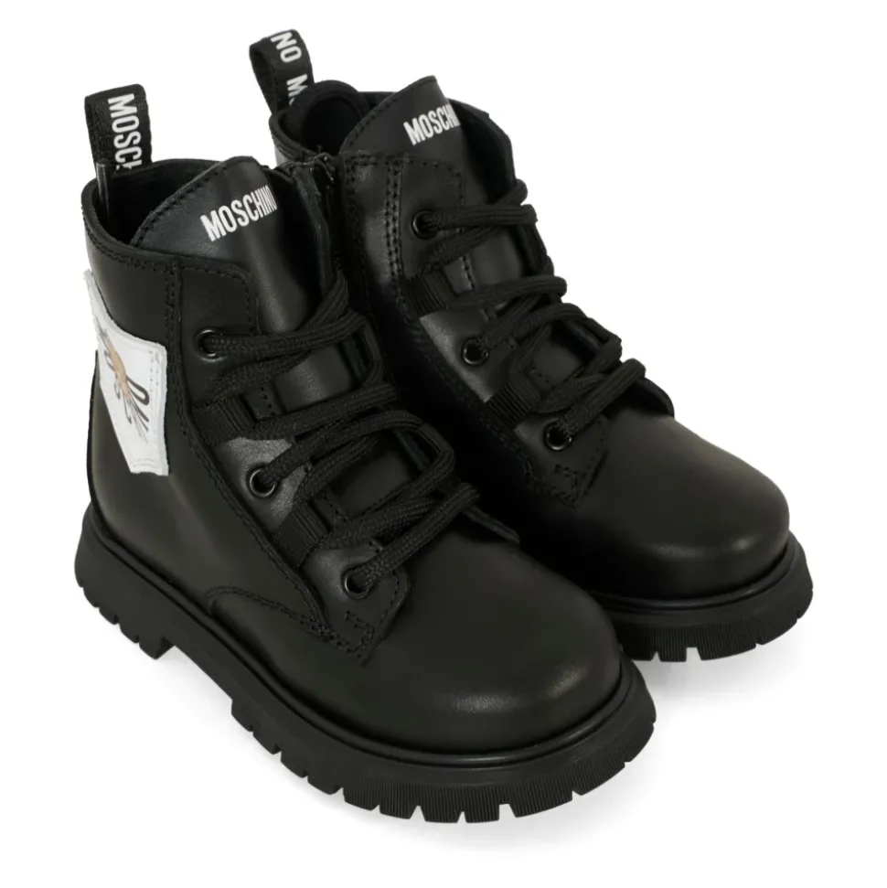 Upgrade de stijl van je kleintje met deze zwarte leren enkellaarsjes van Moschino. Gemaakt in Italië, deze laarsjes hebben een rubberen zool, zijrits, veters, ronde neus en een logotong aan de achterkant. Ze zijn versierd met een witte patch met een Teddybeer en logo. Gemaakt van 100% leer.