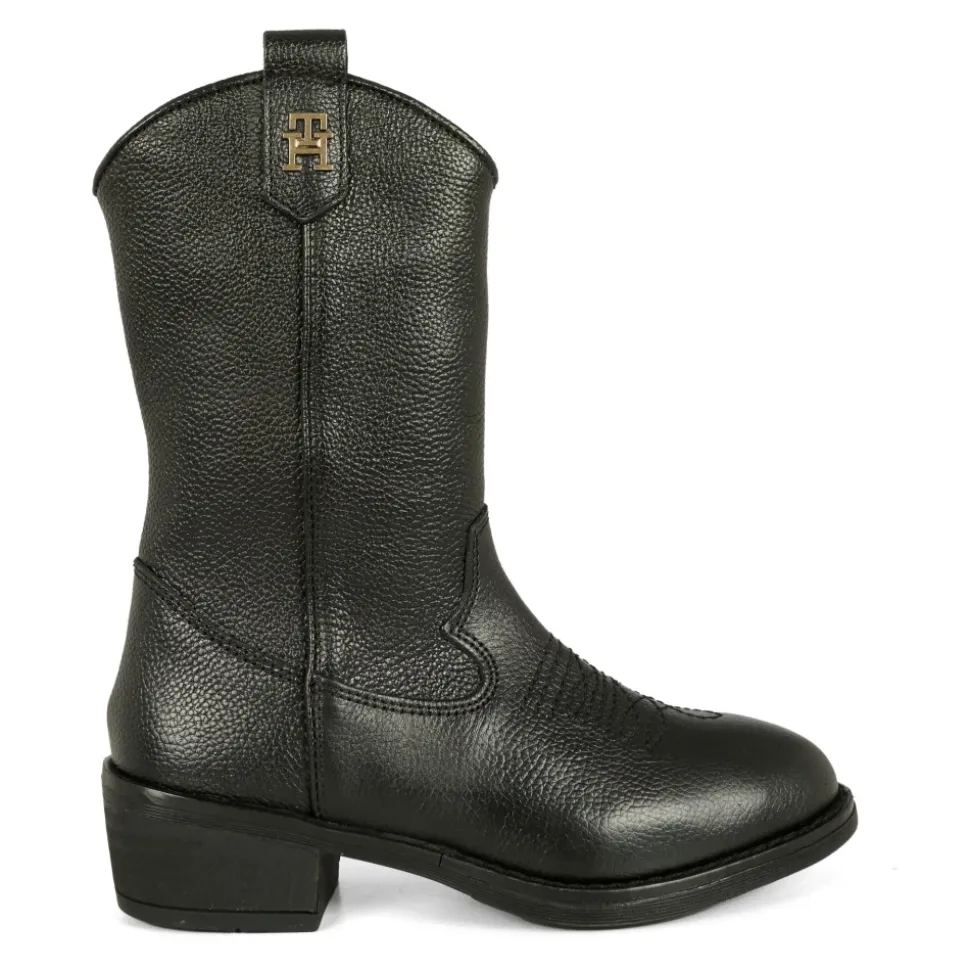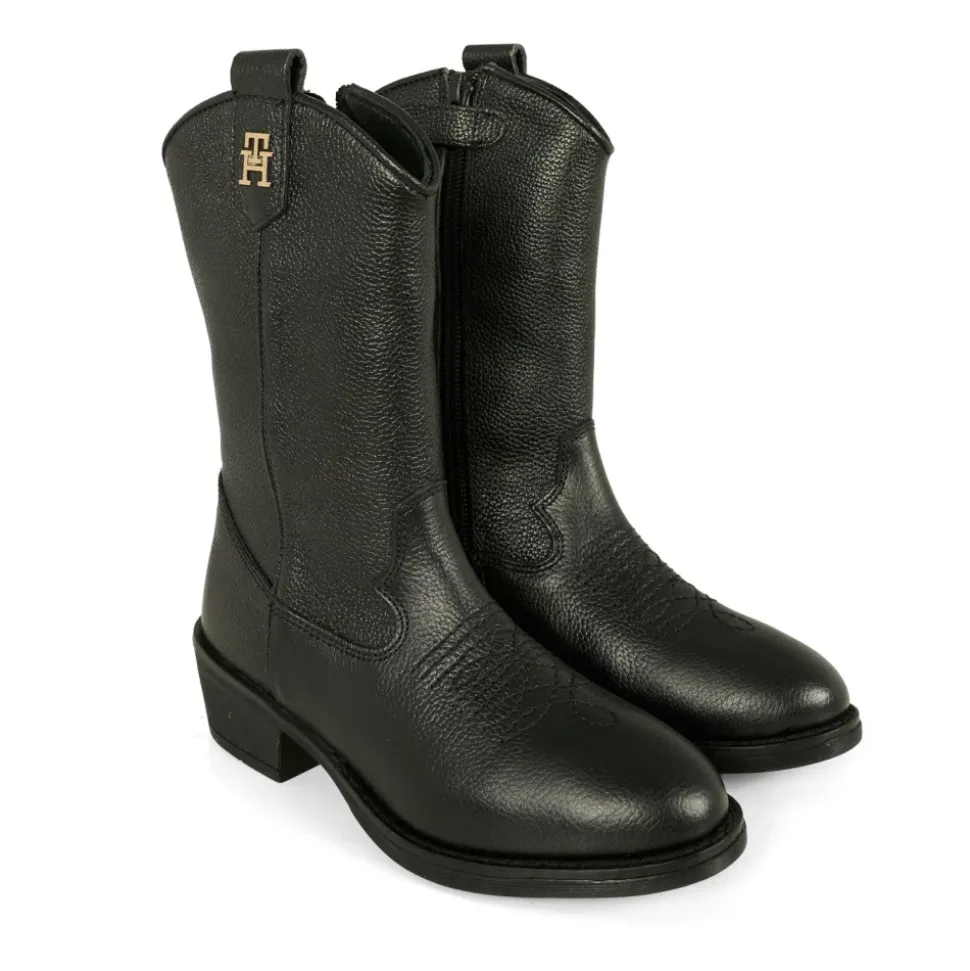 Upgrade de stijl van je kind met deze zwarte leren cowboy laarzen van Tommy Hilfiger. Voorzien van rubberen zolen, een hak, een zijrits en stijlvol stikwerk aan de voorkant. Compleet met een metalen logo opdruk aan de zijkant. Gemaakt van 100% leer.