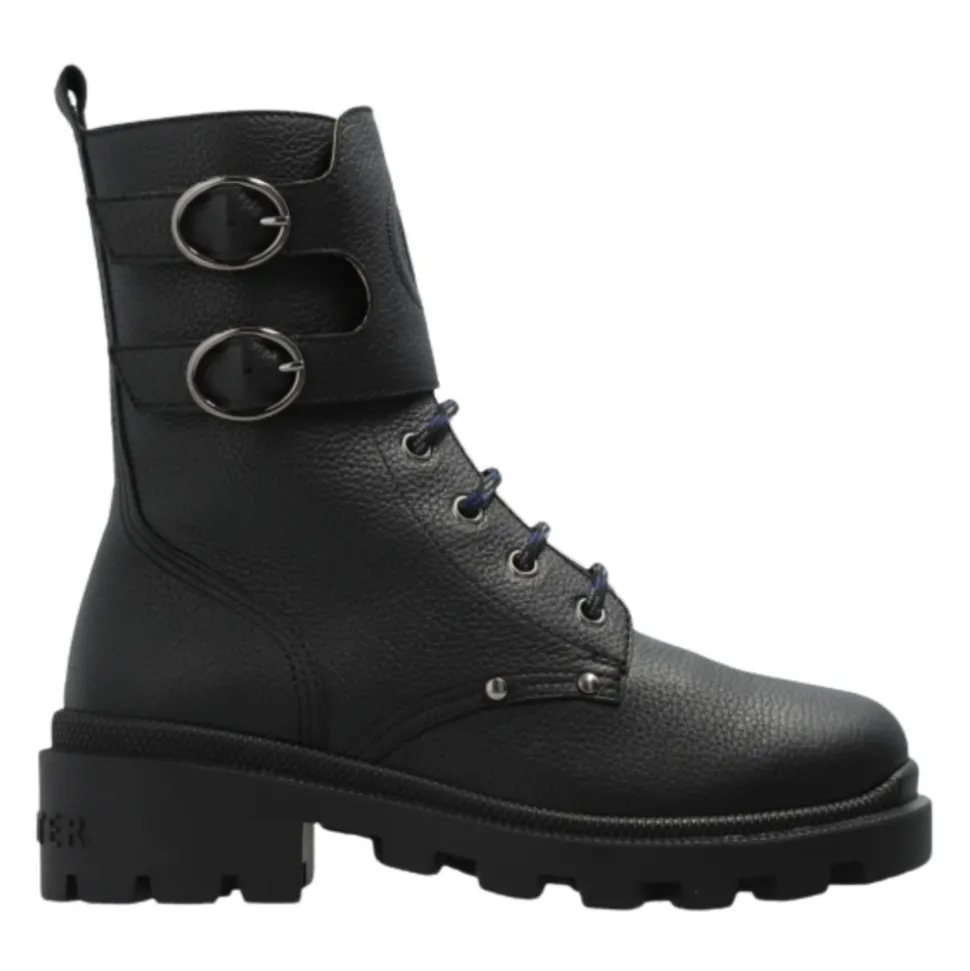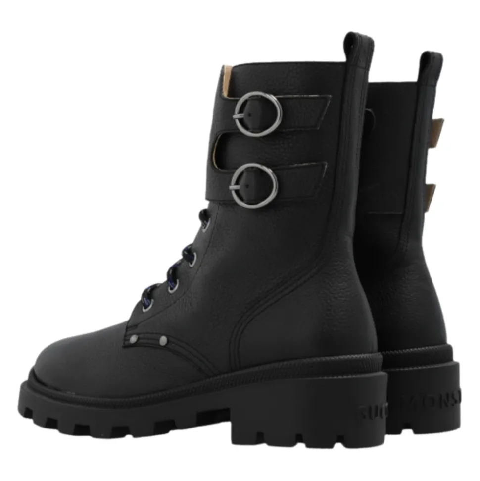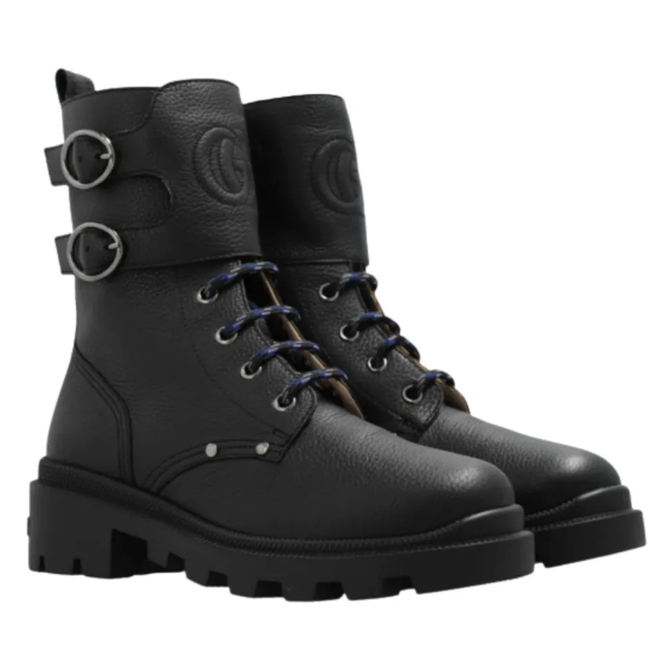 Upgrade de stijl van je kind met deze Gucci Kids zwarte leren veterlaarzen met een rond neusontwerp, lage schacht, zijritssluiting met klittenband, twee bandjes en een voorpaneel met een reliëf ‘Double G’ logo. Gemaakt in Italië met 100% leren buiten- en binnenkant.