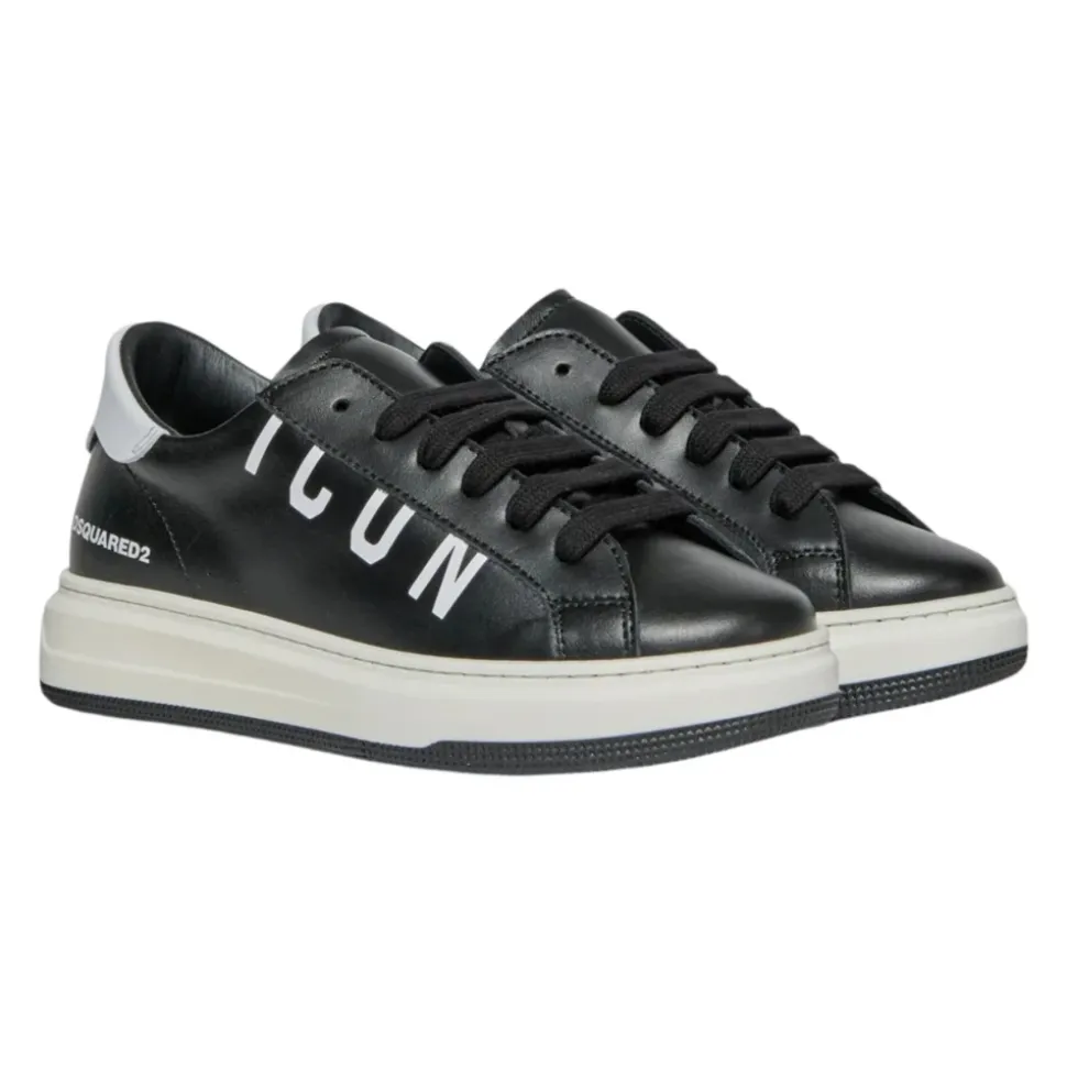Dsquared2 Kids zwarte leren sneakers voor jongens, met vetersluiting, zijdelingse logoprint, witte contrasterende hiel, rubberen zool en leren binnenzool. Gemaakt in Italië.