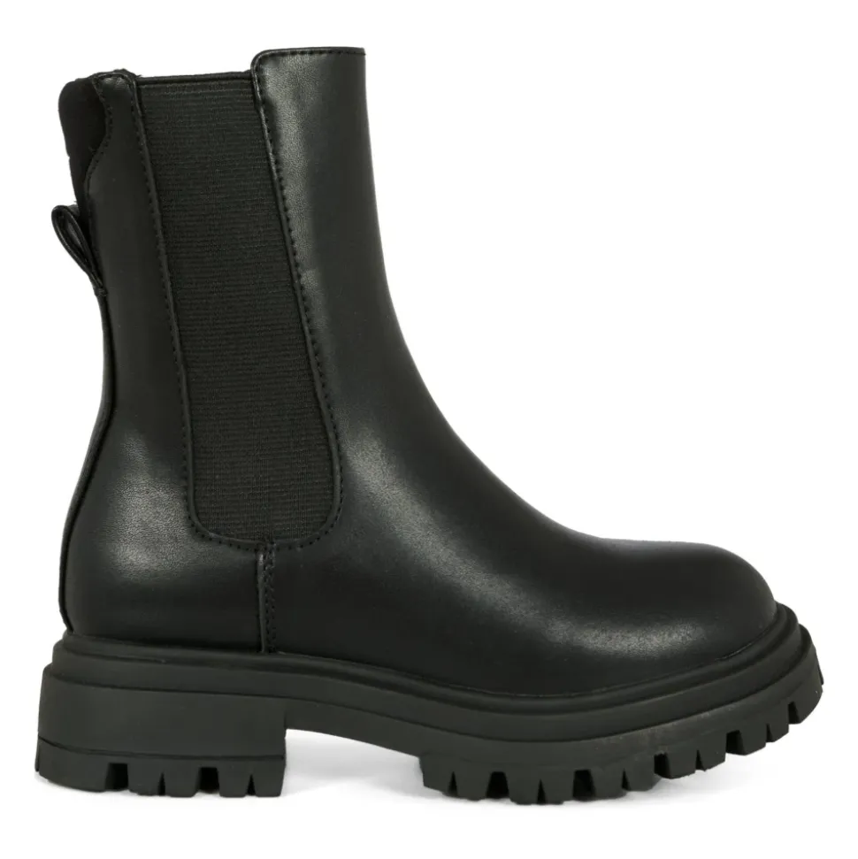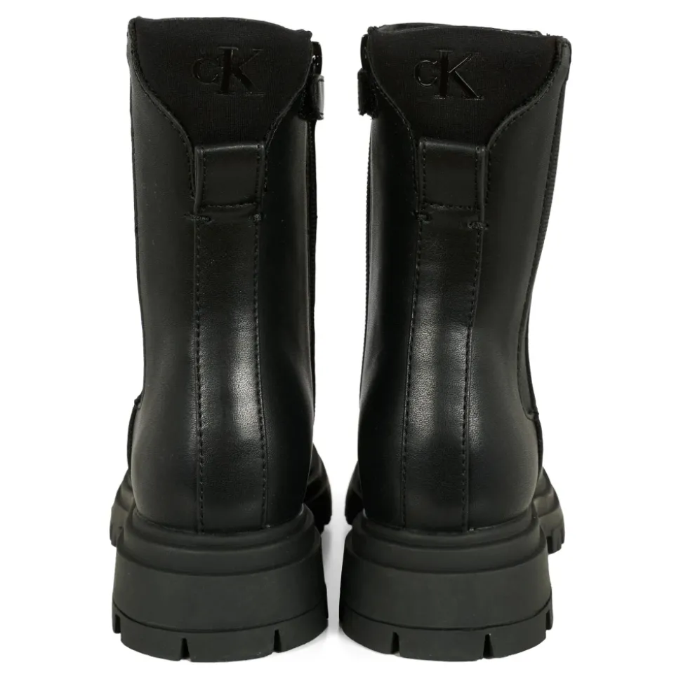 Upgrade de stijl van je kind met deze zwarte leren laarzen van Calvin Klein. Met rubberen zolen, een zijrits, elastisch detail en een ronde neus zijn deze laarzen zowel stijlvol als comfortabel. Compleet met een logo op de achterkant, zijn deze laarzen gemaakt van 50% textiel en 50% synthetische materialen.
