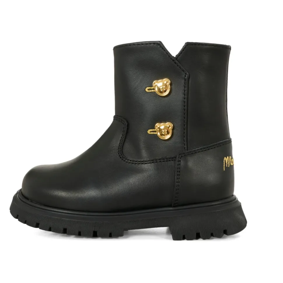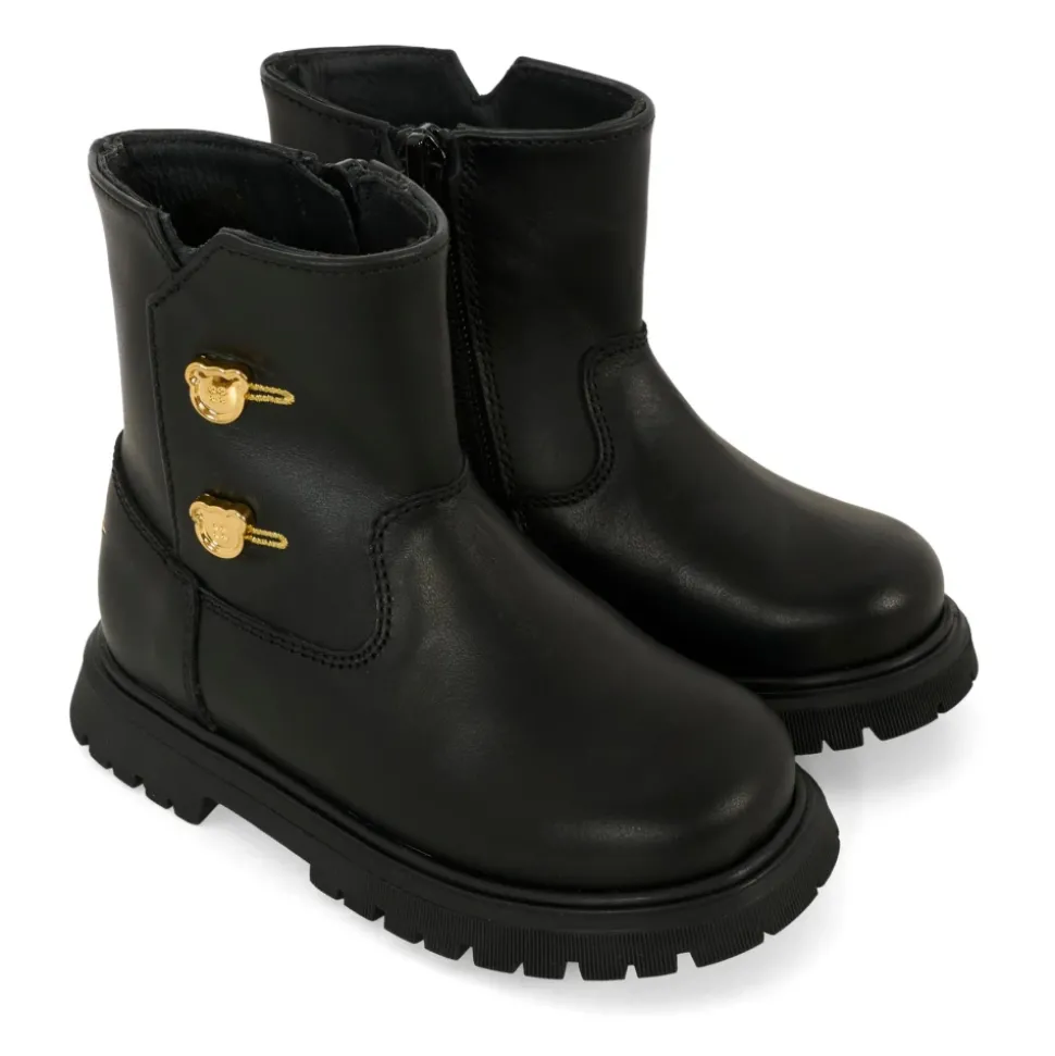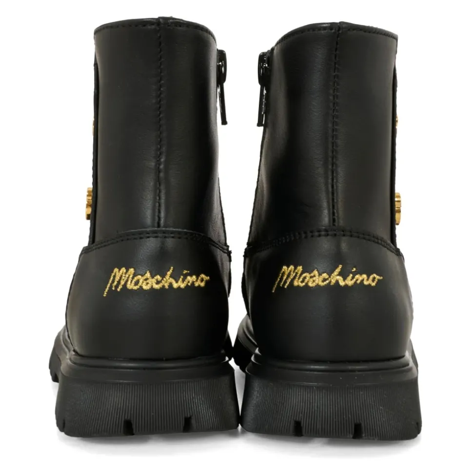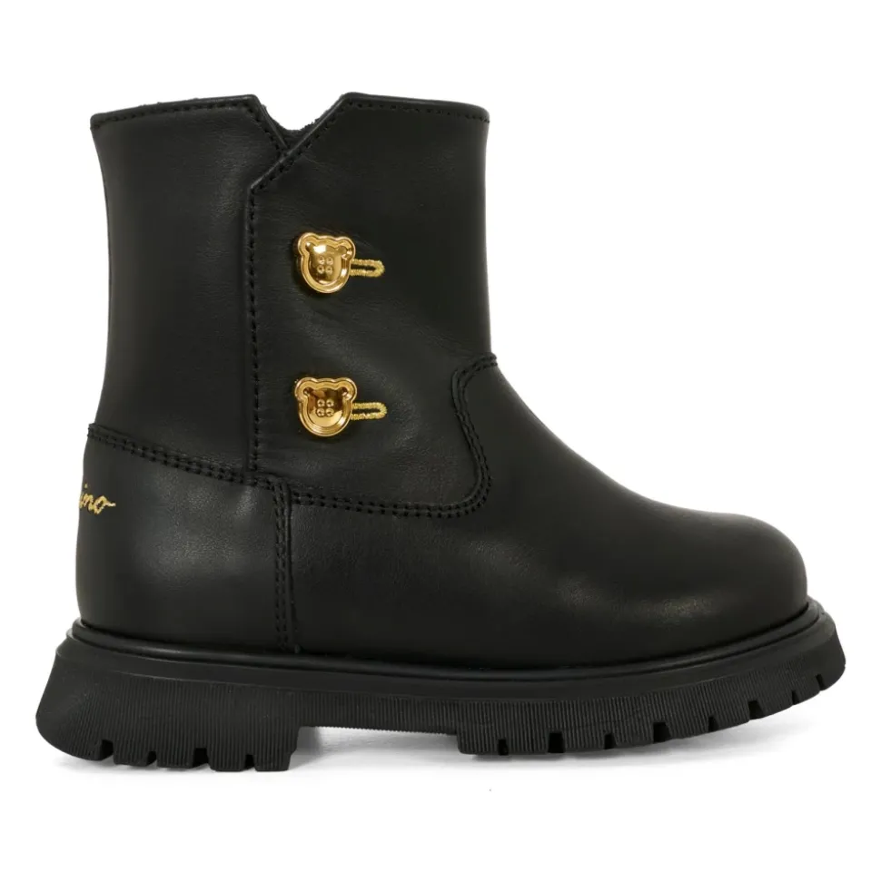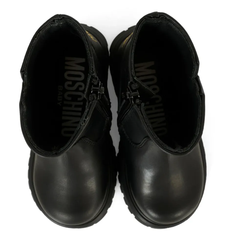 Upgrade de stijl van je kleintje met deze zwarte leren Moschino laarzen. Voorzien van een rubberen zool, zijritssluiting en schattige Teddy Bear-details aan één kant. Gemaakt in Italië van 100% leer, afgewerkt met een geborduurd logo op de achterkant.