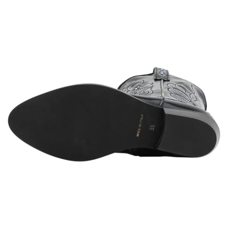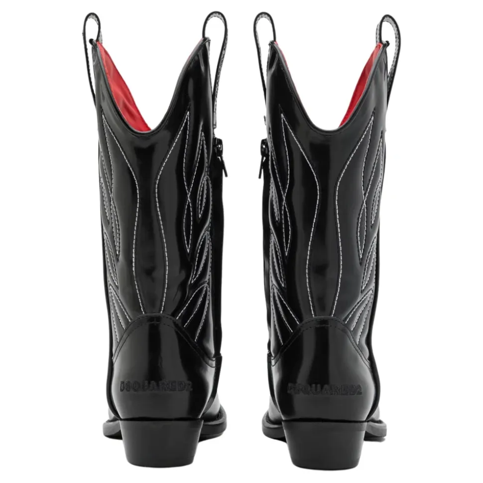 Upgrade de stijl van je kleine meid met deze DSQUARED2 Kids zwarte laarzen van kalfsleer. Met een puntige neus, westers geïnspireerd ontwerp met borduursel, lage hak, zijritssluiting, dubbele tong en logodetail aan de achterkant. Gemaakt in Italië met 100% kalfsleren buitenkant, voering en rubberen zool.