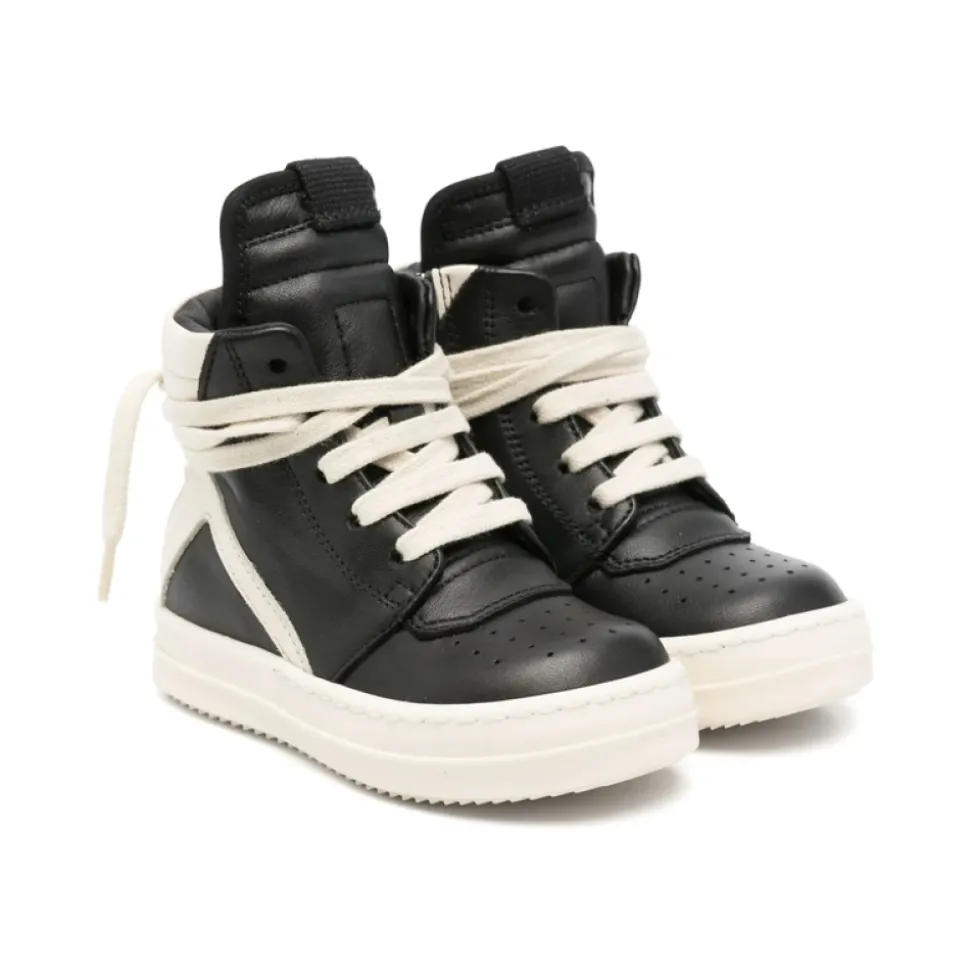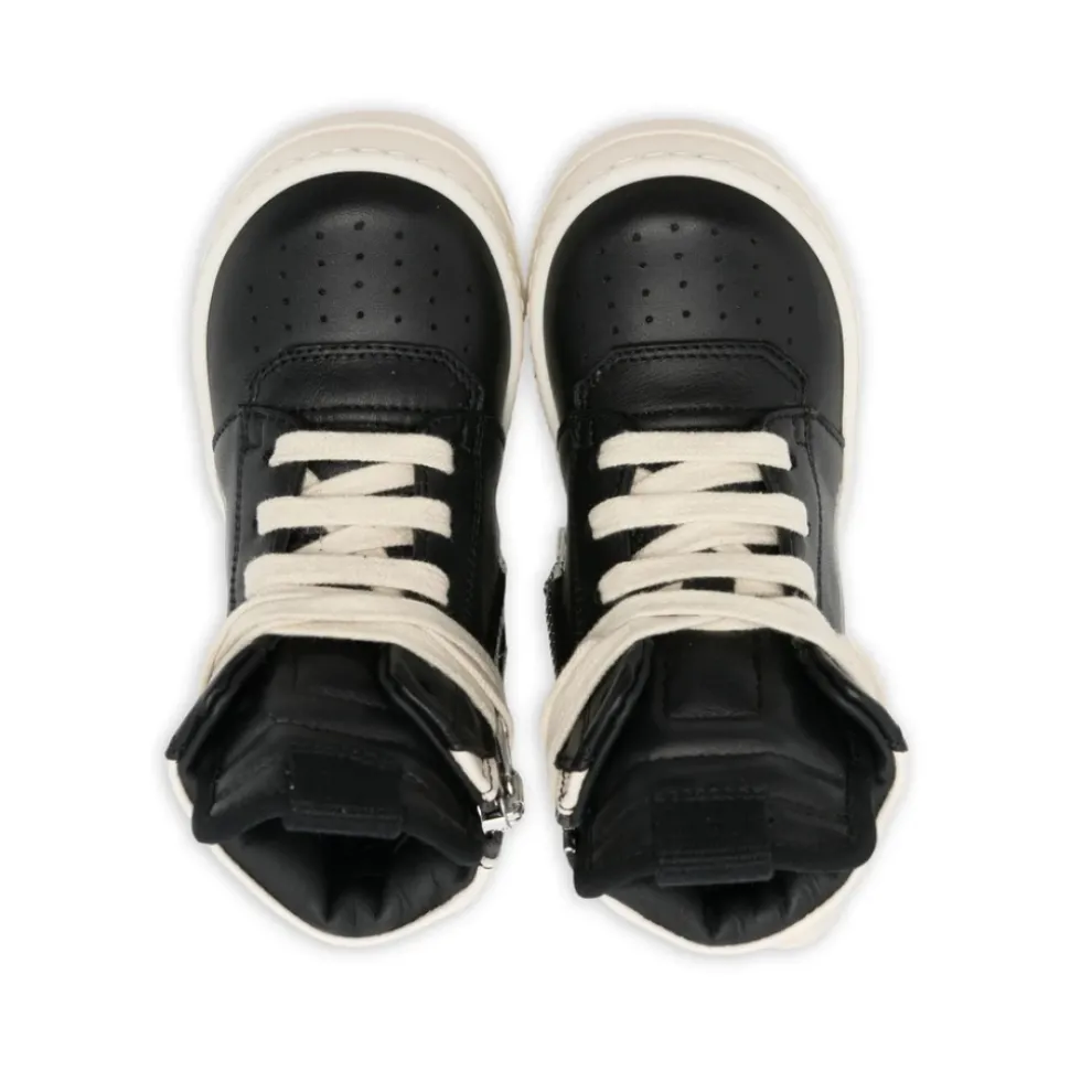 Upgrade de stijl van je kleine man met deze zwarte sneakers van Rick Owens met zijrits en vetersluiting aan de voorkant. Gemaakt met een leren zool, dit stuk wordt geleverd met een beschermende stofzak.