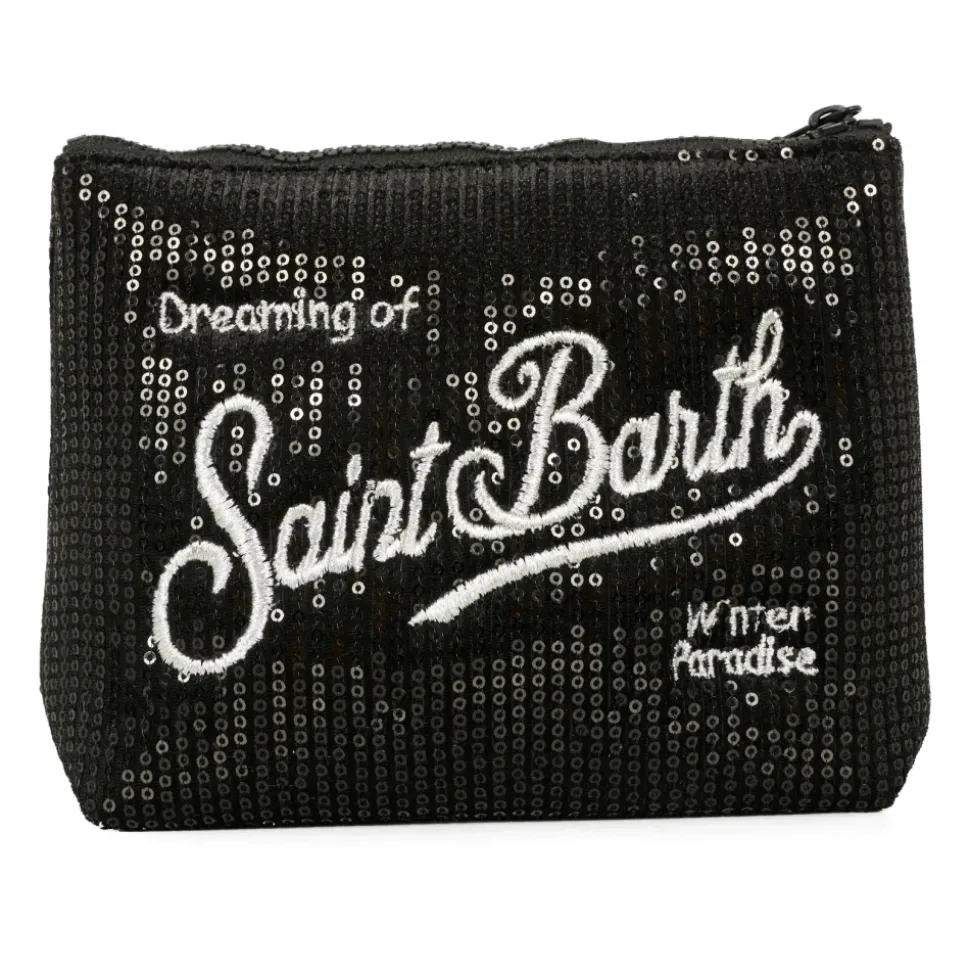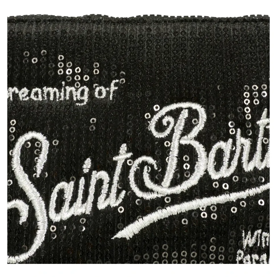 Upgrade de stijl van je kleintje met deze zwarte paillet clutch tas van MC2 Saint Barth. Voorzien van een bovenhandvat, ritssluiting en geborduurd logo aan de voor- en achterkant. Afmetingen: 20cm x 14,5cm x 7cm. Gemaakt van 70% neopreen en 30% polyester.
