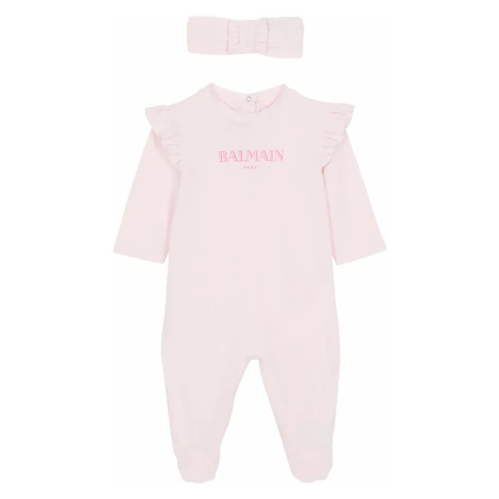 2-delige babyset Bijpassende romper en hoofdband Contrasterend Vintage Balmain-logo Twee-tone verzamelde gerimpelde jersey Drukknopsluiting Hoofdmateriaal: 100% katoen Gemaakt in Portugal Artikel: BXB00AZ3186