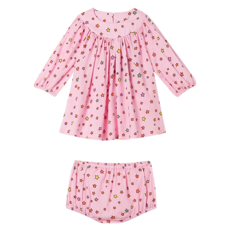 Stella McCartney presenteert de Abito e coulotte con stelle, een gecoördineerde set met sterrenprintdetails voor dagelijks gebruik. Belangrijkste kenmerken: Roze | Sterrenprint | Tweedelige set: jurk en culottes