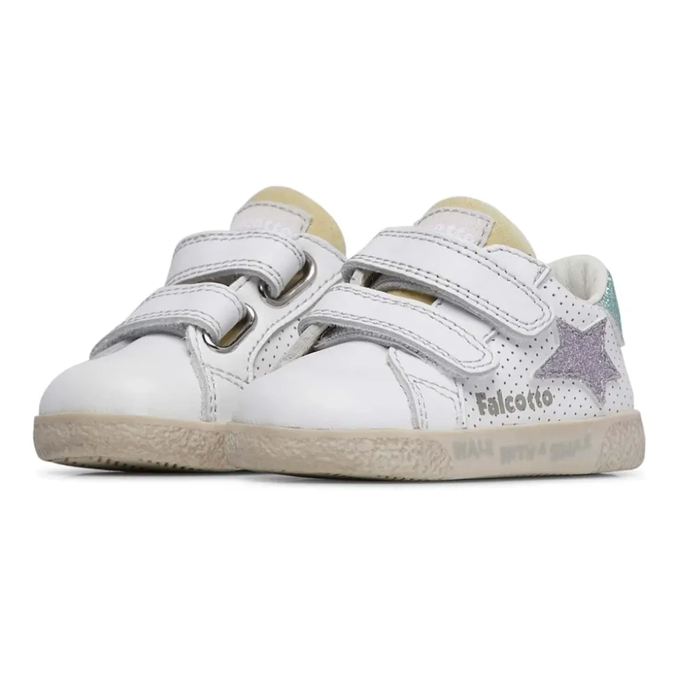 De Falcotto Alnoite 2 VL sneakers combineren een bovenwerk van leer en textiel met een leren voering en binnenzool voor zacht, de hele dag comfort. De dubbele klittenbandsluiting zorgt voor snel en veilig aan- en uittrekken voor dagelijks gebruik. Belangrijkste kenmerken: Wit | Wit lila | Leer en textiel | Zachte leren voering en binnenzool | rubberen buitenzool voor grip | Dubbele klittenbandsluiting | Gemakkelijk aan en uit te trekken en verstelbare pasvorm | Lage sneaker | Bovenwerk van leer en stof met decoratieve sterdetail | Afmetingen en pasvorm: Valt normaal qua maat | Medium breedte | Samenstelling en onderhoud: Bovenwerk: leer en textiel | Voering: leer | Binnenzool: leer | Buitenzool: rubber