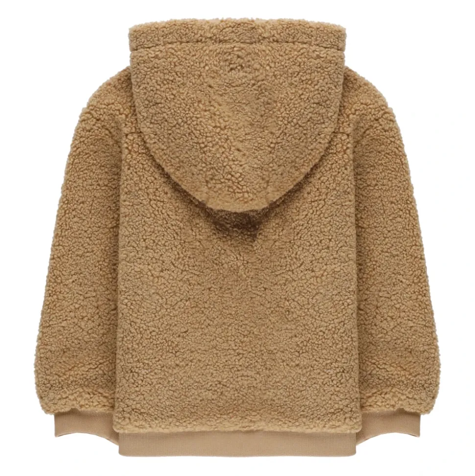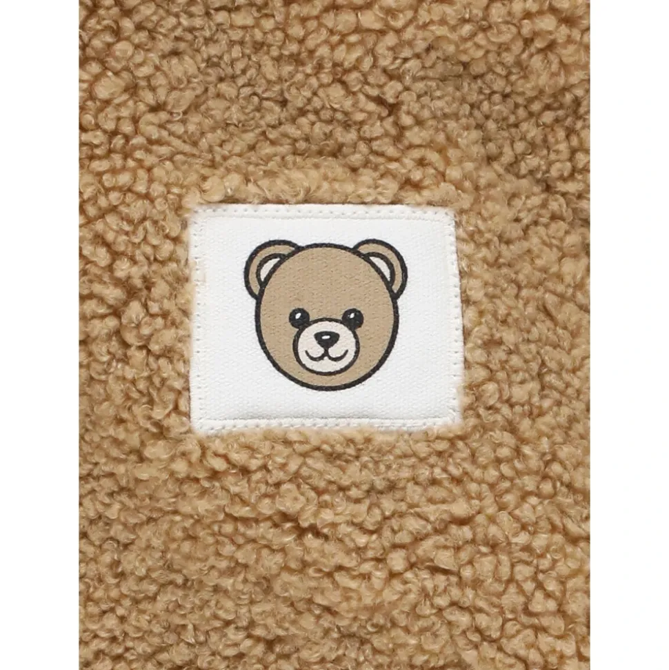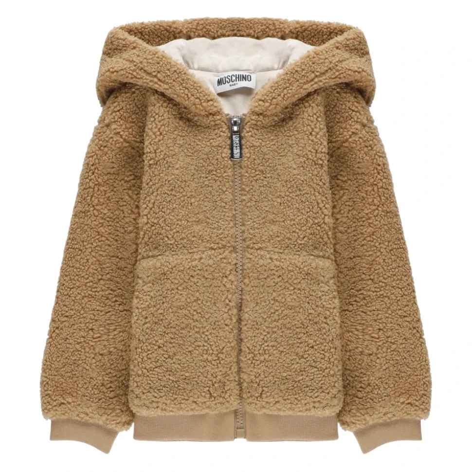 Blijf stijlvol en gezellig met deze beige Moschino Baby bouclé sweatshirt voor jongens. Met capuchon, lange mouwen, ritssluiting aan de voorkant, twee voorzakken en een logo-patch aan de voorkant.