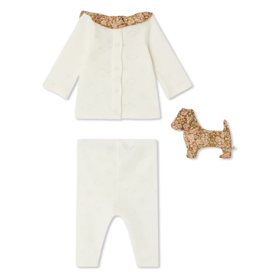 BABYSET: TOP, BROEK EN KNUFFEL van Bonpoint weet te bekoren met zijn tijdloze subtiliteit en belichaamt de essentie van Franse elegantie die is gewijd aan de allerkleinsten. De witte tint van premium kwaliteit katoen met een zachte feel omhult zachtjes de delicate huid van het kind, wat comfort en volledige bewegingsvrijheid garandeert. De klassieke snit bestaat uit een top met lange mouwen die aan de achterkant sluit met knopen en een broek. De set is versierd met een reliëf- of geborduurd motief dat de exclusieve uitstraling van het product prachtig benadrukt. Het kenmerkende knuffeldier dient als verfijnde finishing touch, terwijl de meesterlijke aandacht voor detail blijkt uit elk element van de set. Dit product, gecreëerd door het merk Bonpoint, combineert traditie met een moderne benadering van de kindergarderobe, waardoor het de keuze is van veeleisende ouders die uitzonderlijke kwaliteit en verfijnde esthetiek waarderen. WAAROM DIT PRODUCT KOPEN? * Ongeëvenaard comfort en zachtheid van katoen van de hoogste kwaliteit * Uniek, delicaat geborduurd patroon overal * Praktische en elegante oplossingen – knoopsluiting voor gemakkelijk aankleden * Luxueus Frans merk met een tijdloze esthetiek * Unieke set aangevuld met een schattige knuffel