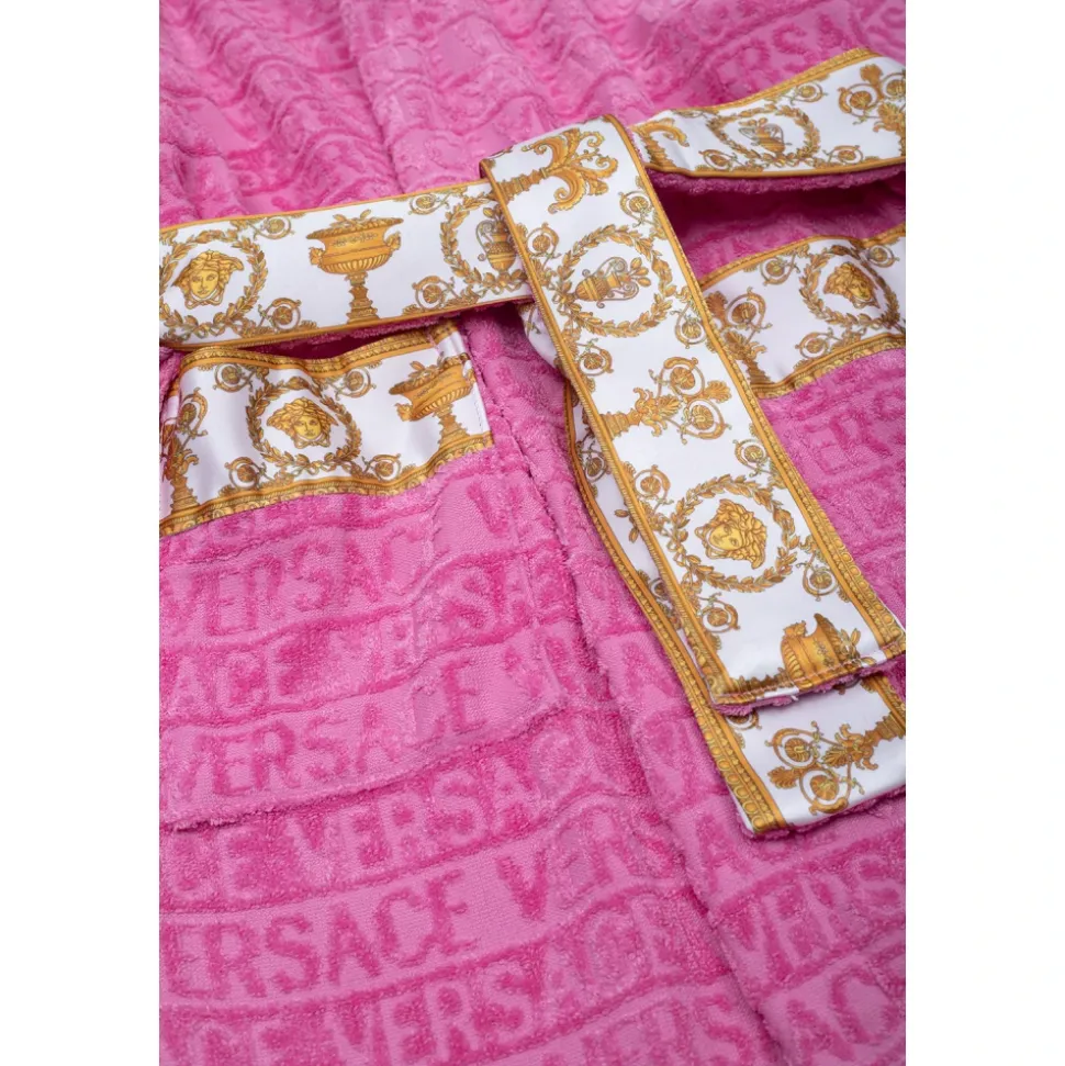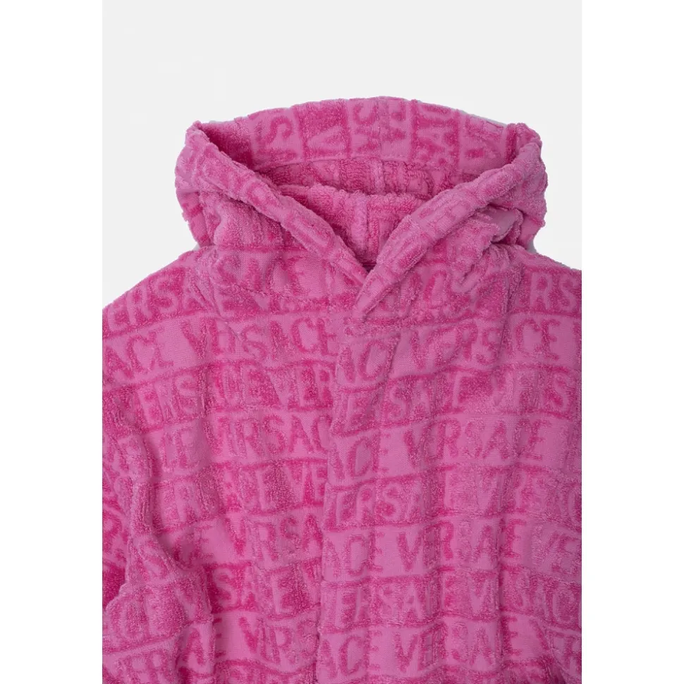 Roze badjas met capuchon van Versace Kids. Verrijkt met een tastbaar monogrammotief, heeft dit model witte en gele Barocco-inzetstukken, een taille-cinch-tie riem, twee voorzakken en lange mouwen.