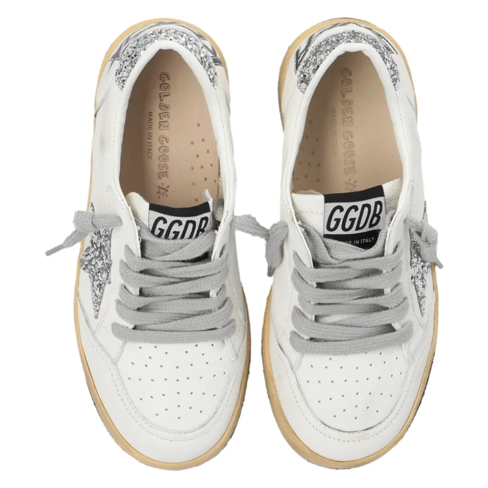 Witte ‘Ball’ sneakers met een versleten effect van Golden Goose Kids. Gemaakt van leer, dit paar heeft perforaties aan de voorkant, het kenmerkende sterrenpatch van het merk en hielkap versierd met glitter, zwart print en rubberen zool in zwart en beige. Zoolhoogte: 1,5 cm Zoolhoogte op het hoogste punt: 2 cm Klanten hebben gemeld dat dit merk groot uitvalt. We raden aan om één maat kleiner te kiezen dan je gebruikelijke maat.
