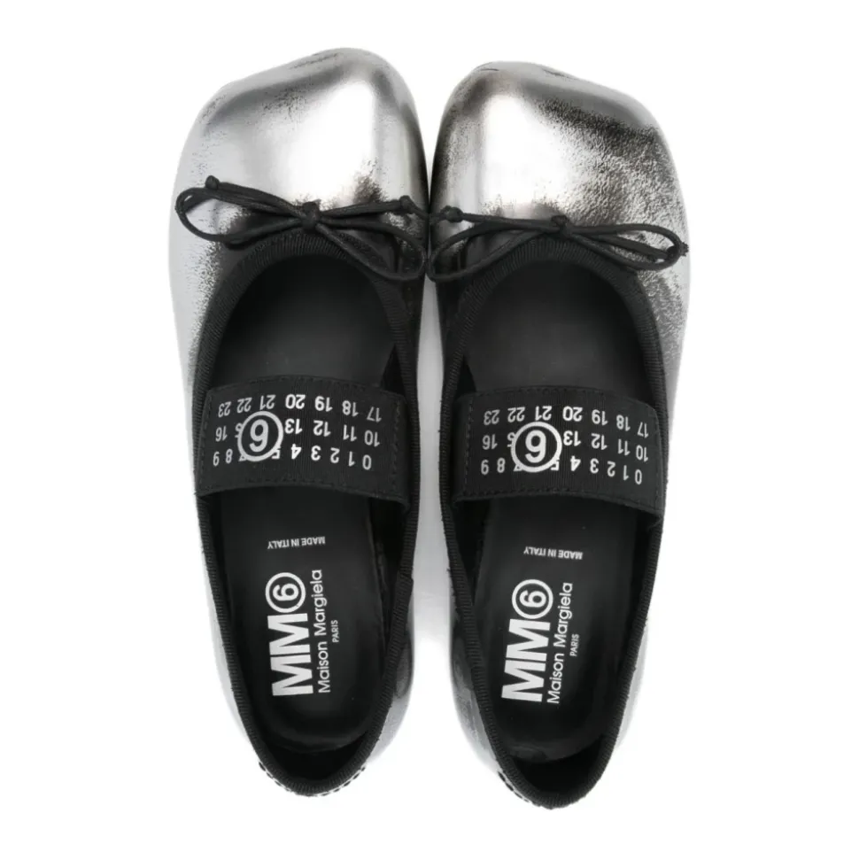 MM6 Maison Margiela Ballerine con fascia logo is een minimalistische ballerina flat die wordt gekenmerkt door een merkband die een grafisch accent toevoegt aan een klassiek silhouet. Ideaal voor dagelijks gebruik, combineert het de strakke lijnen van een ballerina met een opvallend logodetail. Belangrijkste kenmerken: Zwart | Logoband | Ballerina silhouet