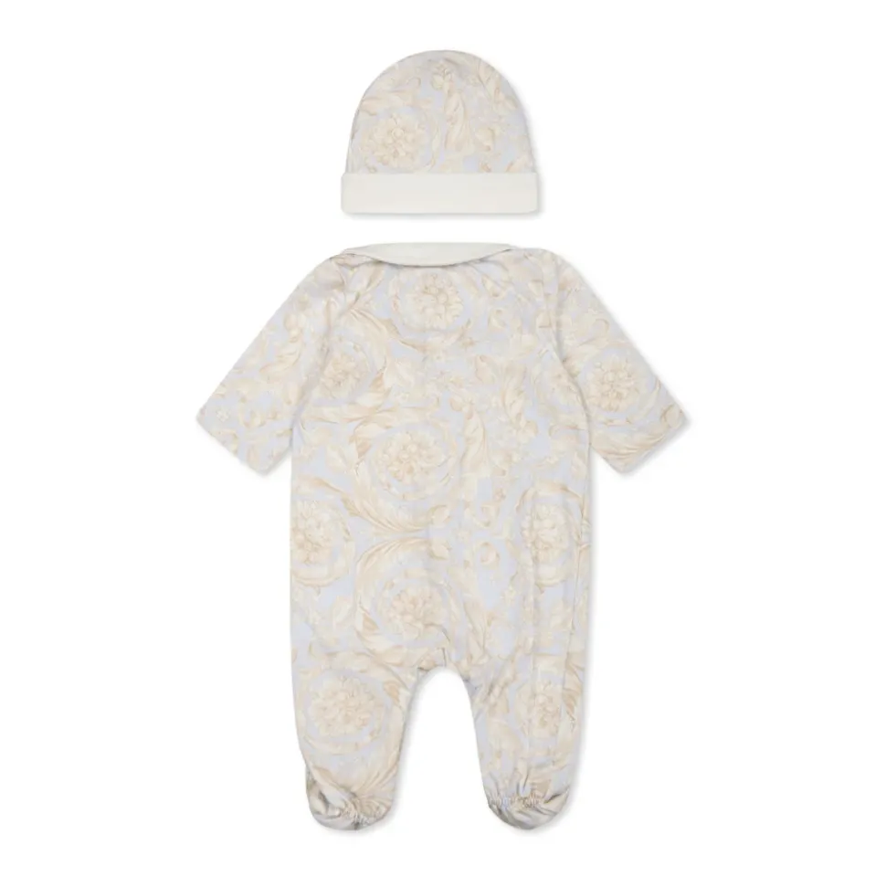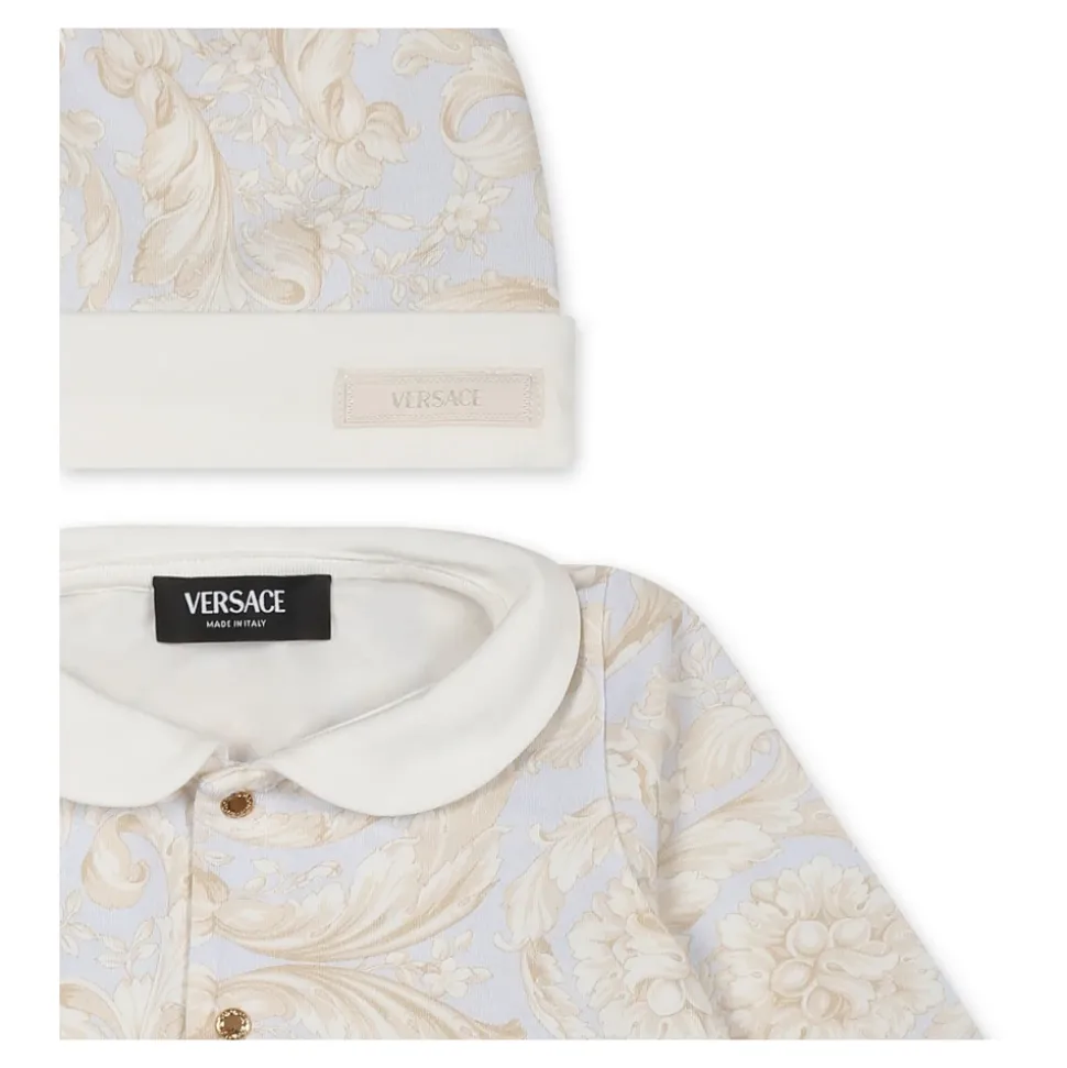 Kleed uw kleintje in luxe met deze Baroque Print Babygrow en Hoed Set van Versace. Deze set, gemaakt in Italië, bestaat uit een babygrow met lange mouwen en een Peter Pan-kraag en een bijpassende hoed, beide versierd met de iconische Barokprint. Belangrijkste kenmerken: Lichtblauw | Multicolor | Katoenmix | Drukknoopsluiting | Voeten | Peter Pan-kraag | Lange mouwen | All-over Barokprint | Contrasterende manchet op de hoed | Logopatch op de hoed | Samenstelling en onderhoud: 91% Katoen | 9% Elastaan | Machinewas op 30°C