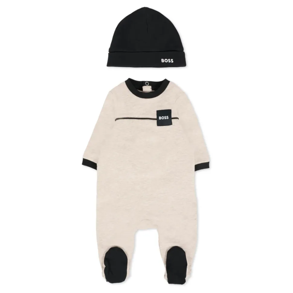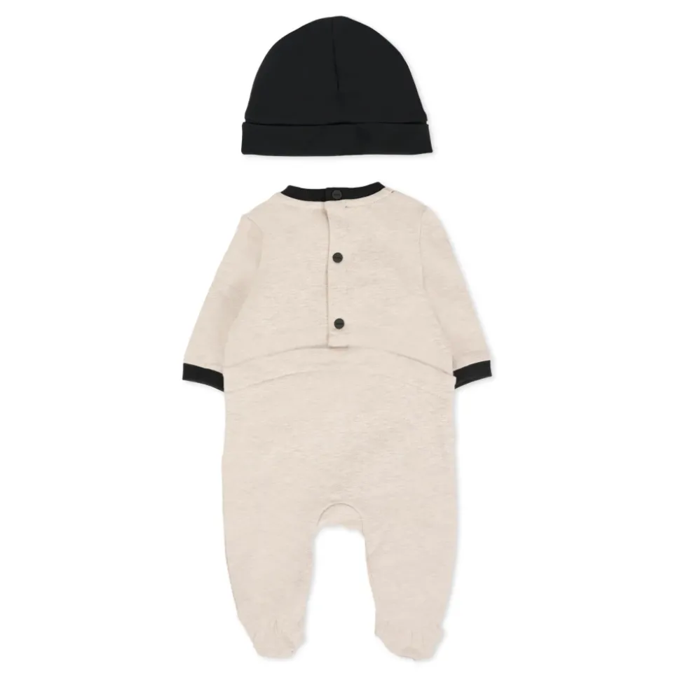 Kleed je kleintje in stijl met deze Hugo beige katoenmix fleece babygrow en hoedenset. De babygrow heeft lange mouwen, een geribbelde ronde hals, zwarte manchetten, drukknopen op de achterkant en voeten, versierd met een logopatch op de borst. De set bevat ook een zwarte manchethoed met een logo aan de voorkant. Gemaakt van 95% katoen en 5% elastaan. Machinewasbaar op 30°C voor eenvoudig onderhoud.