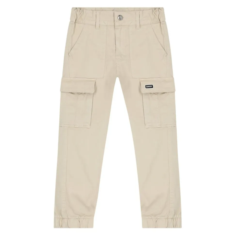 DKNY Kids beige broek voor jongens, met een elastische tailleband aan de achterkant, centrale knoop- en ritssluiting, twee zijzakken, twee cargozakken aan de zijkanten, geborduurd logodetail, en elastische enkels. Gemaakt van 98% katoen 2% elastaan.