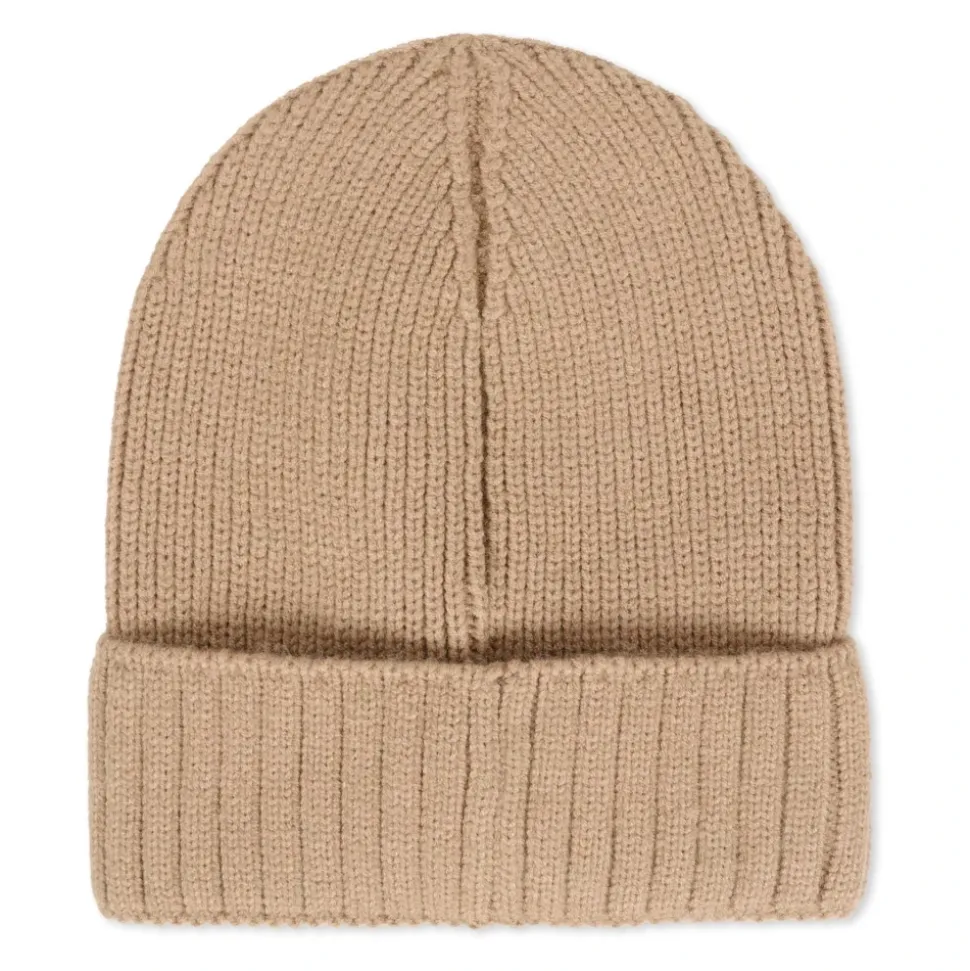 Voeg een stijlvolle touch toe aan de outfit van je kind met deze beige gebreide muts van Hugo. Met een omslag en een wit rubberen logo aan de voorkant, is deze muts gemaakt van een mix van viscose, polyester, acryl en polyamide. Makkelijk te onderhouden, gewoon wassen in de machine op 30°C.