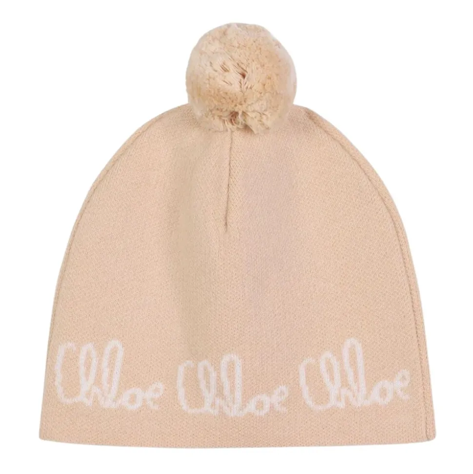 Houd je kleintje warm en stijlvol met deze Chloé beige gebreide muts met een schattige pom pom bovenop en een jacquard logodetail. Gemaakt van een katoenmix met 90% katoen en 10% wol. Machinewasbaar op 30°C.