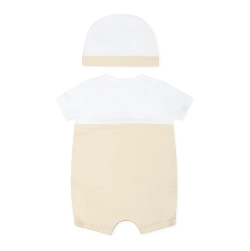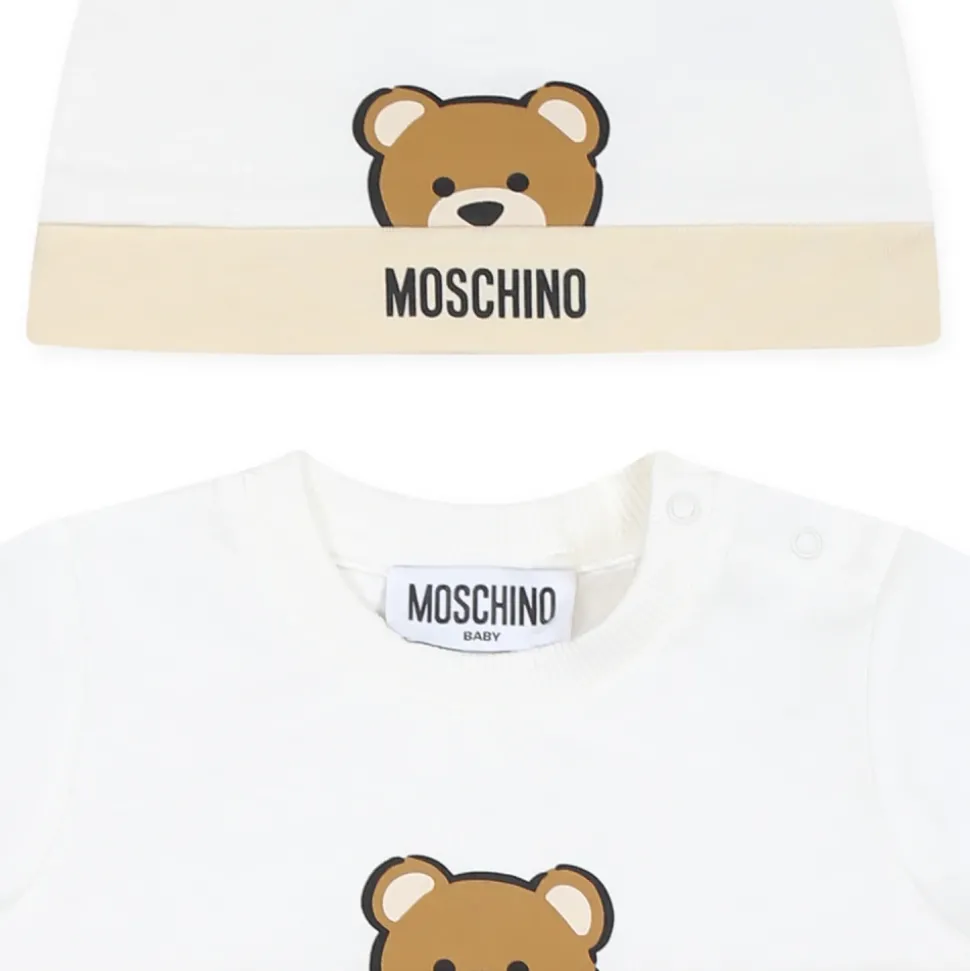 Kleed je kleintje in stijl met deze beige romperset van het merk Moschino Kids. Gemaakt van 100% katoen, deze set bestaat uit een korte mouw romper met een geribbelde ronde hals, drukknoopsluiting en schattige Teddy Bear en logo details. Maak de look compleet met de witte hoed met Teddy Bear en logo. Machinewasbaar op 30°C.