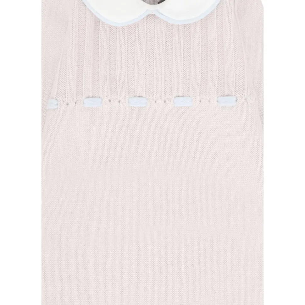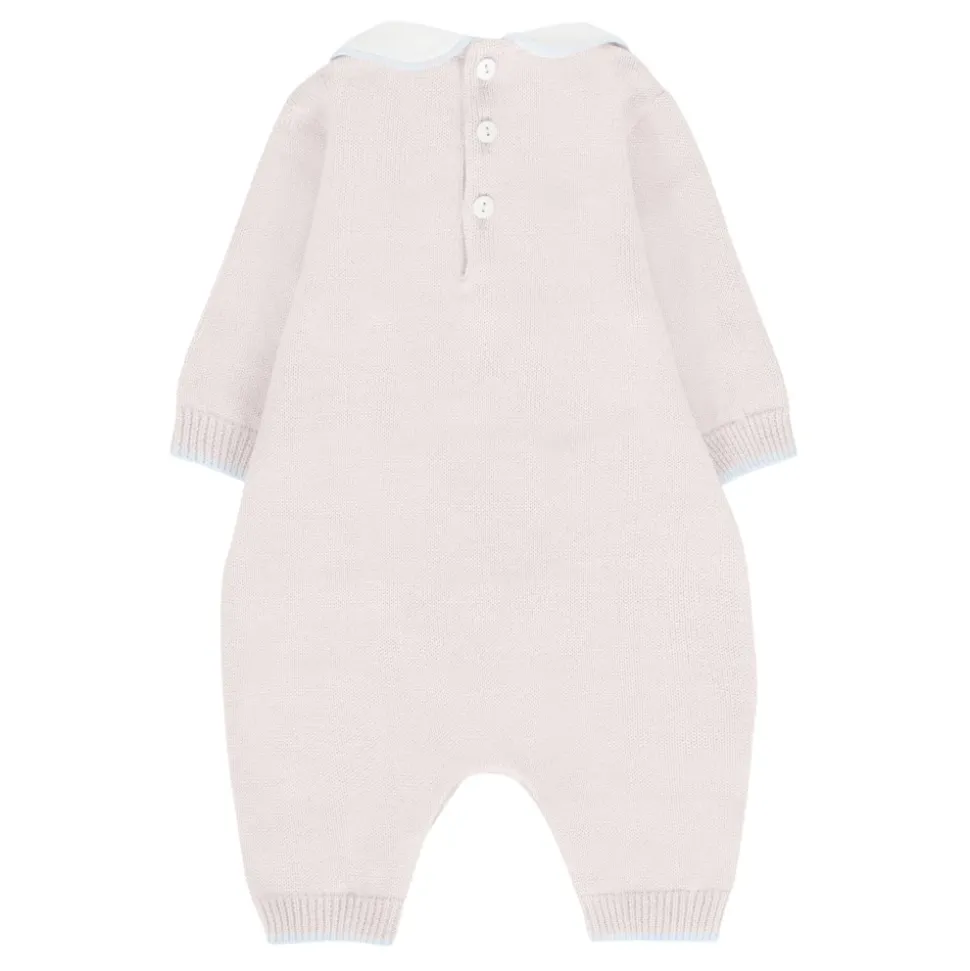 Kleed je kleintje in stijl met deze beige wollen jumpsuit van Little Bear. Met lange mouwen, een katoenen poplin Peter Pan kraag, moeder-of-pearl knoopsluiting aan de achterkant en tussen de benen, en versierd met een lichtblauw lint aan de voorkant. Gemaakt in Italië van 100% zuivere wol. Wasinstructies: Wassen op 30°C.