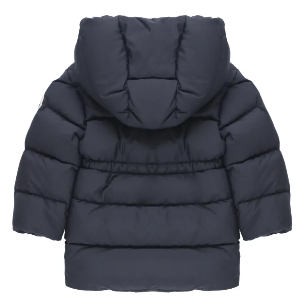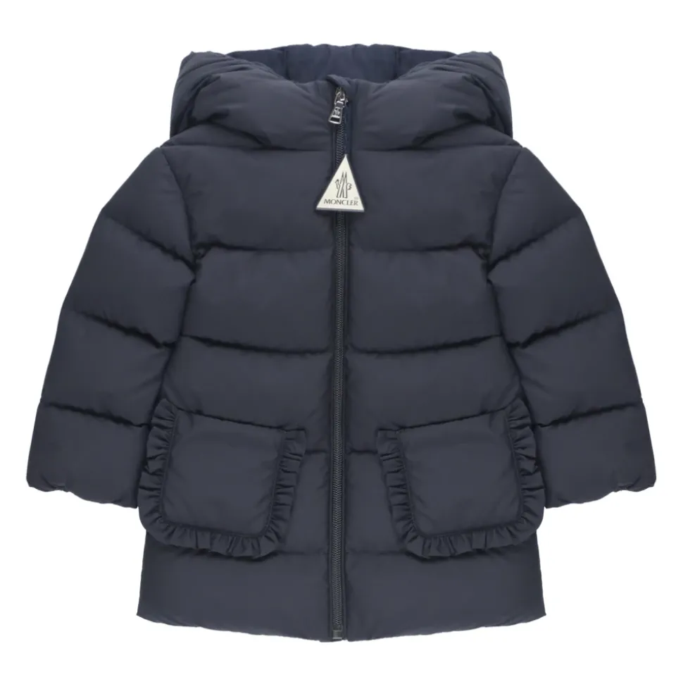 Blijf warm en stijlvol deze winter met de blauwe Moncler Baby gewatteerde donsjas voor meisjes. Deze jas heeft een capuchon, lange mouwen met elastische manchetten, een geborduurd Moncler embleem op de linker mouw, een ritssluiting aan de voorkant en twee voorzakken.