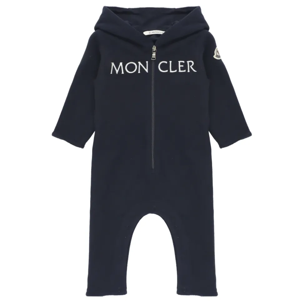 Kleed je kleine jongen in stijl met deze donkerblauwe Moncler Baby onesie. Voorzien van een capuchon, lange mouwen en een contrasterende kleur logo-patch op de linkermouw. De ritssluiting aan de voorkant en drukknopen aan de onderkant maken het aankleden gemakkelijk en snel. Op de voorkant is ook een contrasterend gekleurd geborduurd logo te zien voor extra charme.