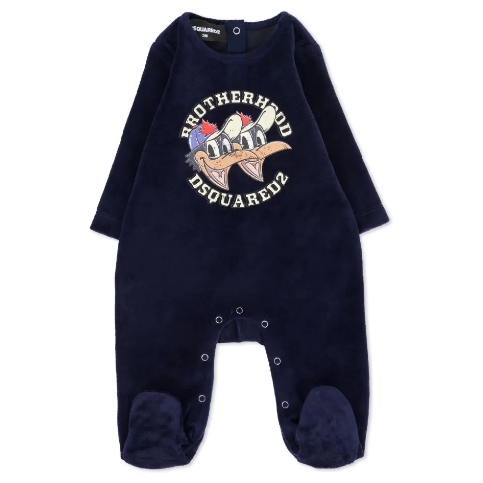 Kleed je kleintje in stijl met deze blauwe chenille boxpak van Dsquared2. Met lange mouwen, een ronde hals, voetjes en handige drukknopen aan de achterkant en tussen de benen. Versierd met een schattige eend en logo print op de voorkant met een uniek verwoest effect. Gemaakt van 80% katoen en 20% polyester. Machinewasbaar op 30°C.