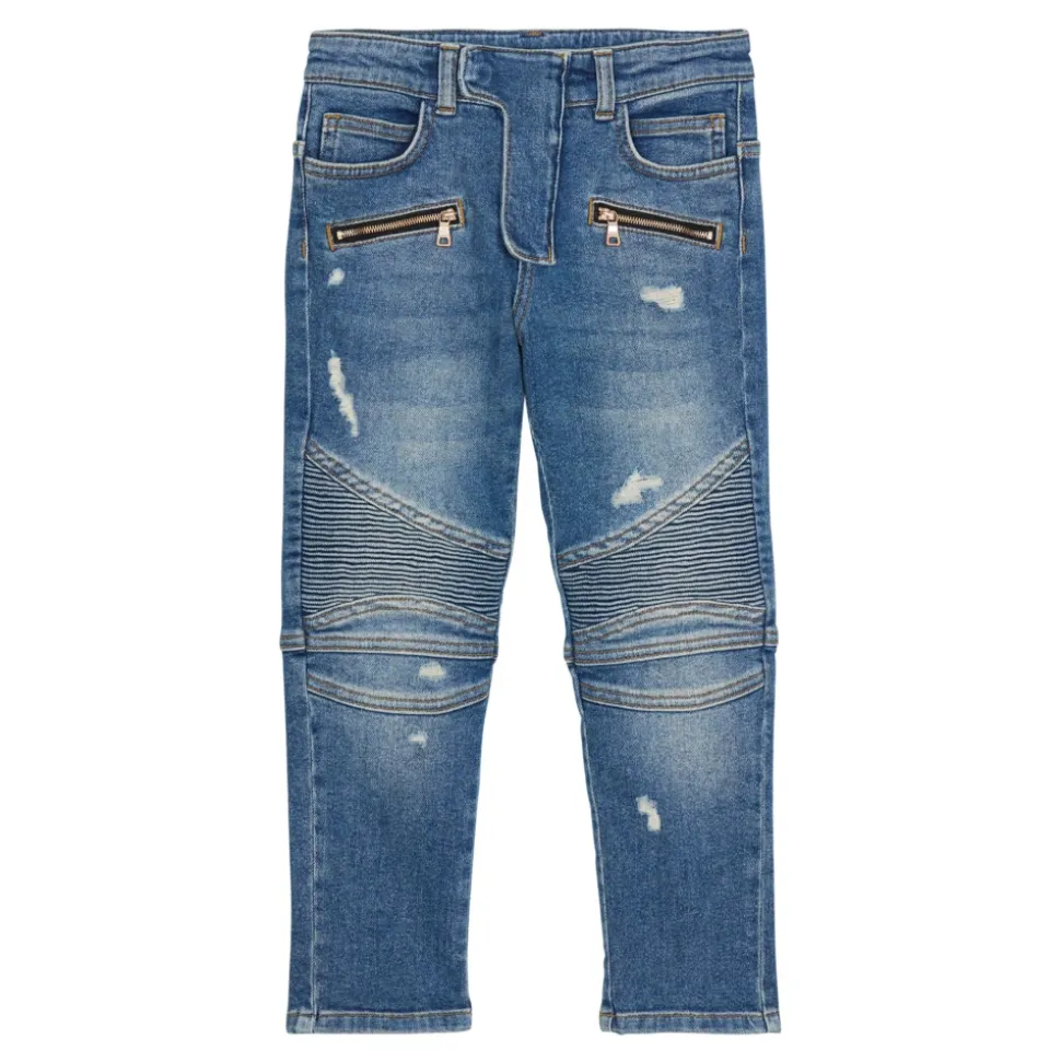 Blauwe denim biker jeans Tailleband met riemlussen Vlieg Rits- en drukknoopsluiting onder een overslag 5 klassieke zakken 2 zichtbare ritssluitingzakken, Balmain Paris-gegraveerde slider Geribbelde knieën Regular fit Hoofdmateriaal: 99% katoen 1% elastaan Gemaakt in Turkije Artikel: BW6R90Z2363
