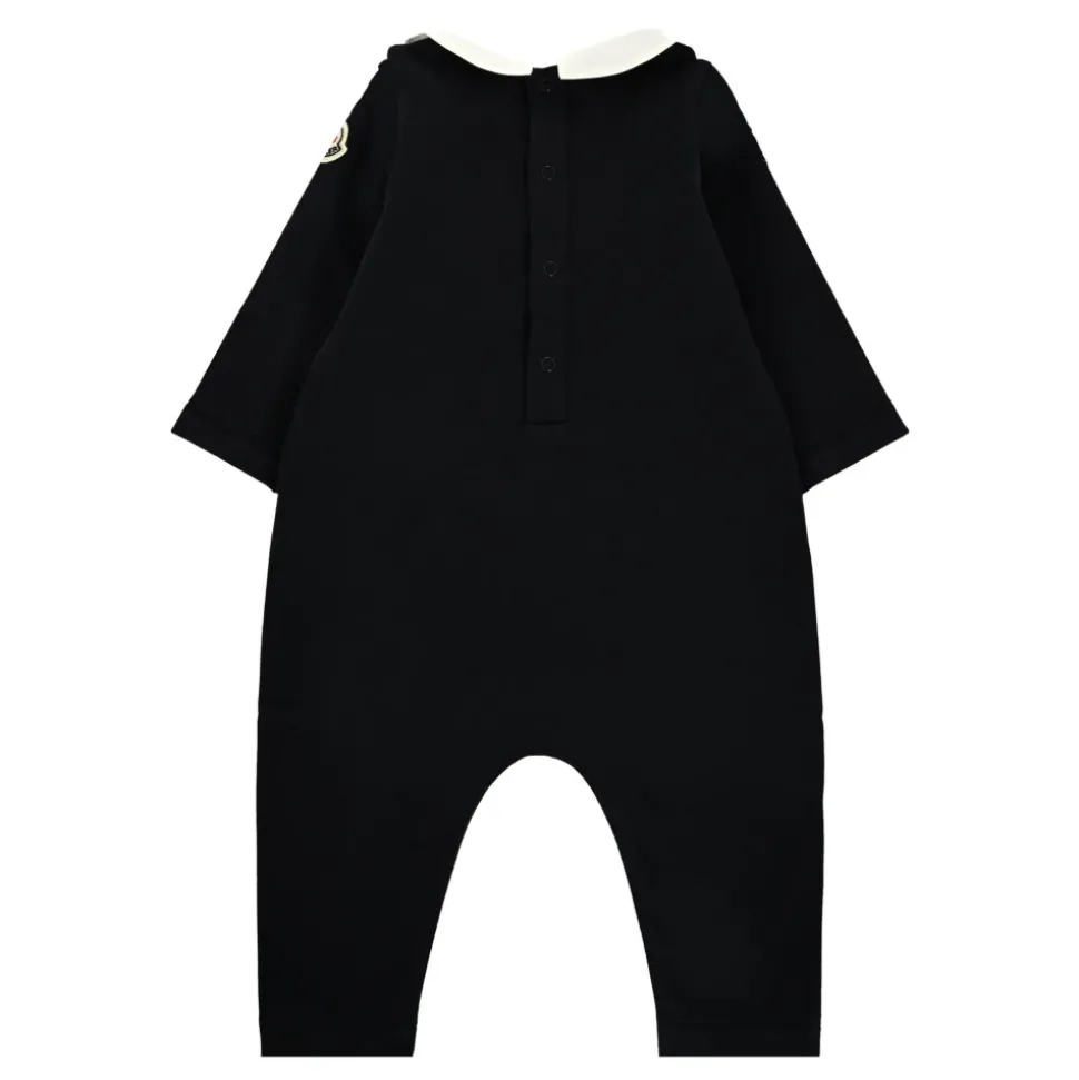Kleed je kleintje in stijl met deze blauwe fleece babygrow van het luxe merk Moncler Kids. Voorzien van een witte puntkraag in poplin, lange mouwen, drukknoopsluiting op de rug en tussen de benen, en versierd met een geborduurd logo op de voorkant en een iconisch logopatch op de mouw. Gemaakt van 95% katoen en 5% elastaan. Machinewas op 30°C.