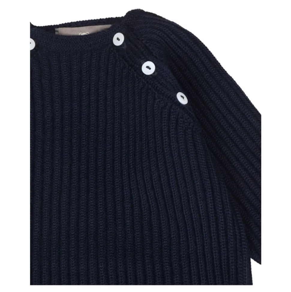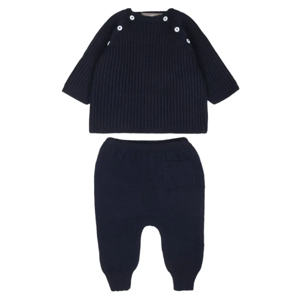 Kleed je kleintje in stijl met deze set van twee marineblauwe wollen broeken van Little Bear. Met geribbeld breisel, geribbelde afwerking, ronde hals, decoratieve knoopdetails, lange raglanmouwen, elastische tailleband en een voorzak.