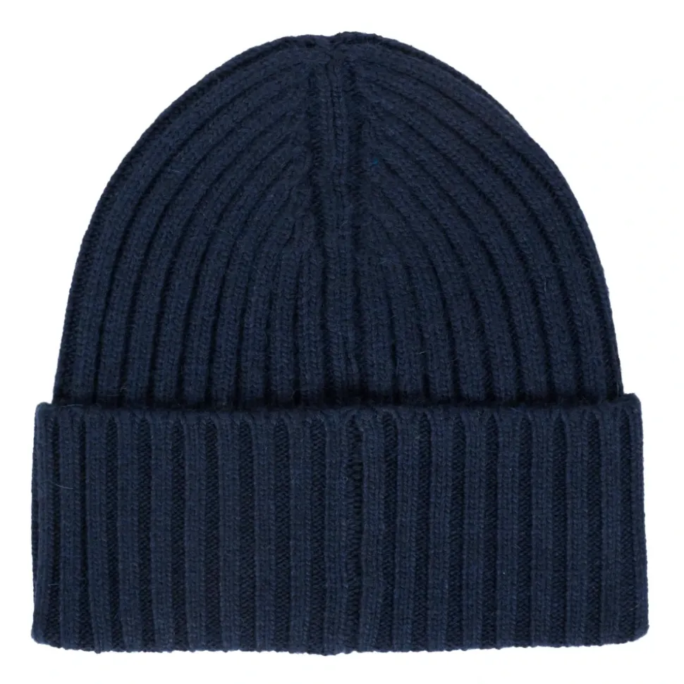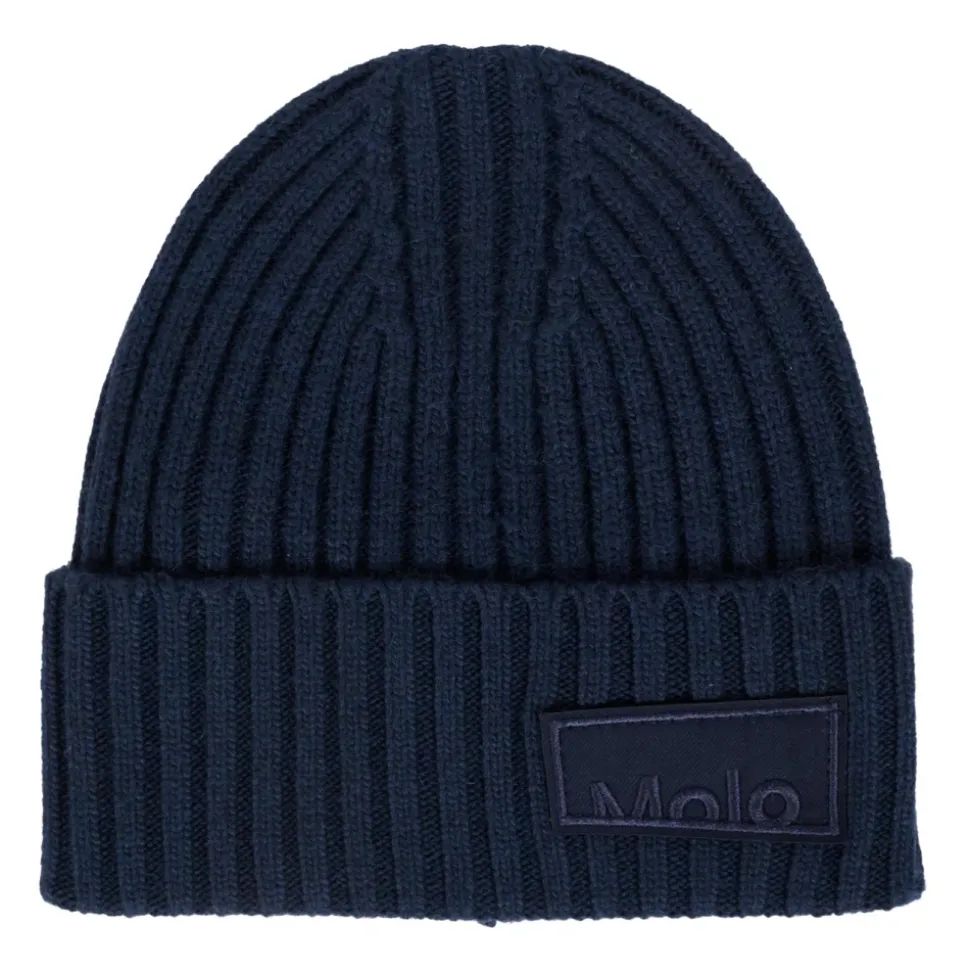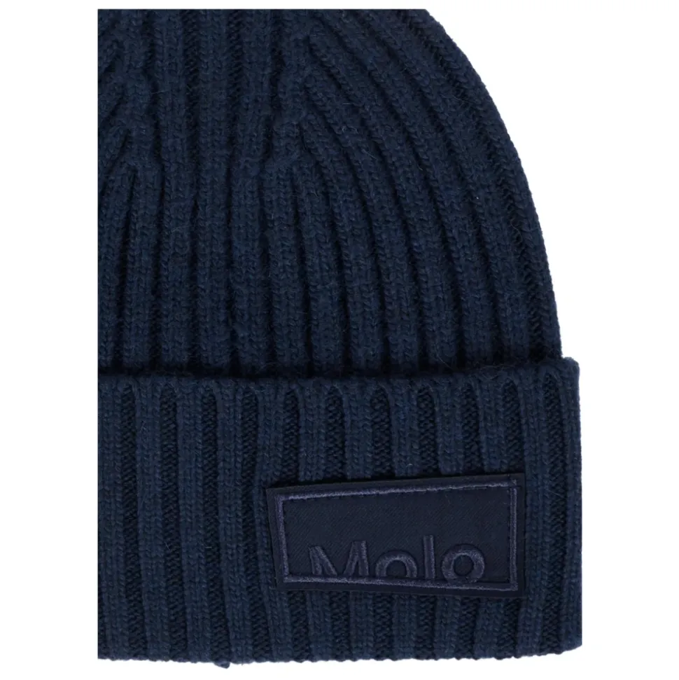 Blijf stijlvol en warm met deze Molo blauwe geribbelde muts van een wolmix, versierd met een logopatch aan de voorkant. Gemaakt van 55% viscose, 25% polyamide, 15% polyester en 5% kasjmier. Machinewas op 30°C.