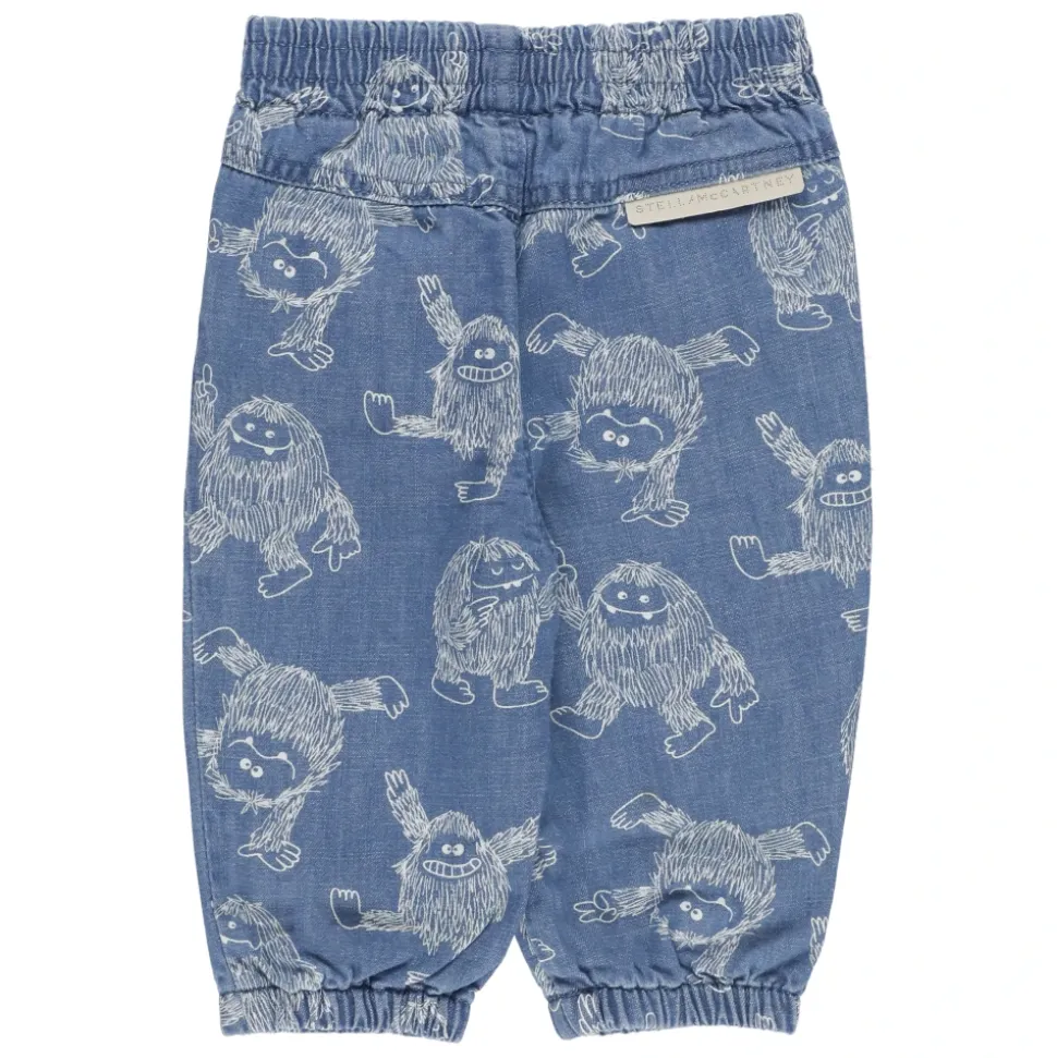 Blauwe Stella McCartney Junior katoenen jeans voor meisjes met elastische taille, twee zijdelingse steekzakken, elastische zoom, all-over contrasterend kleurpatroon en achterste logotab.