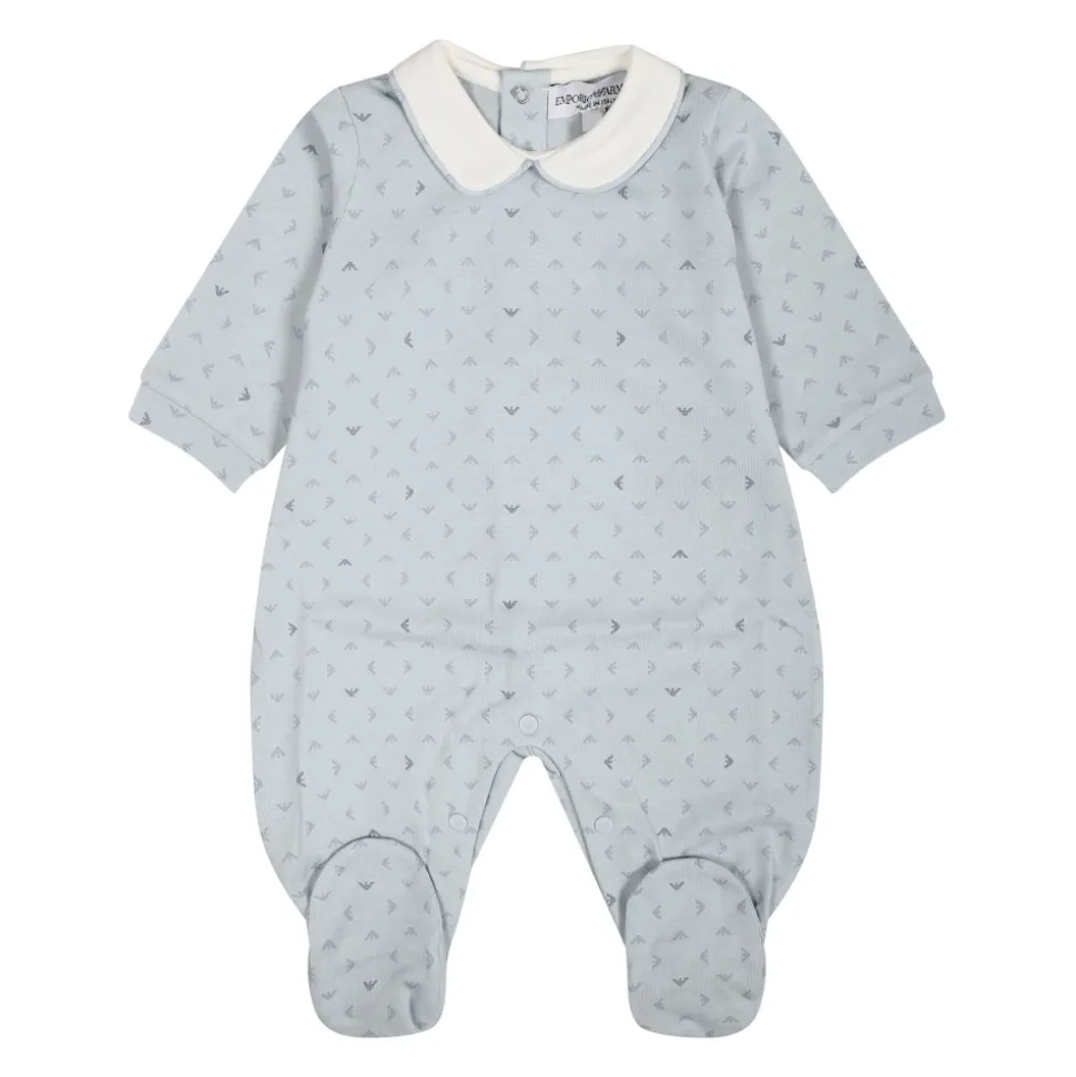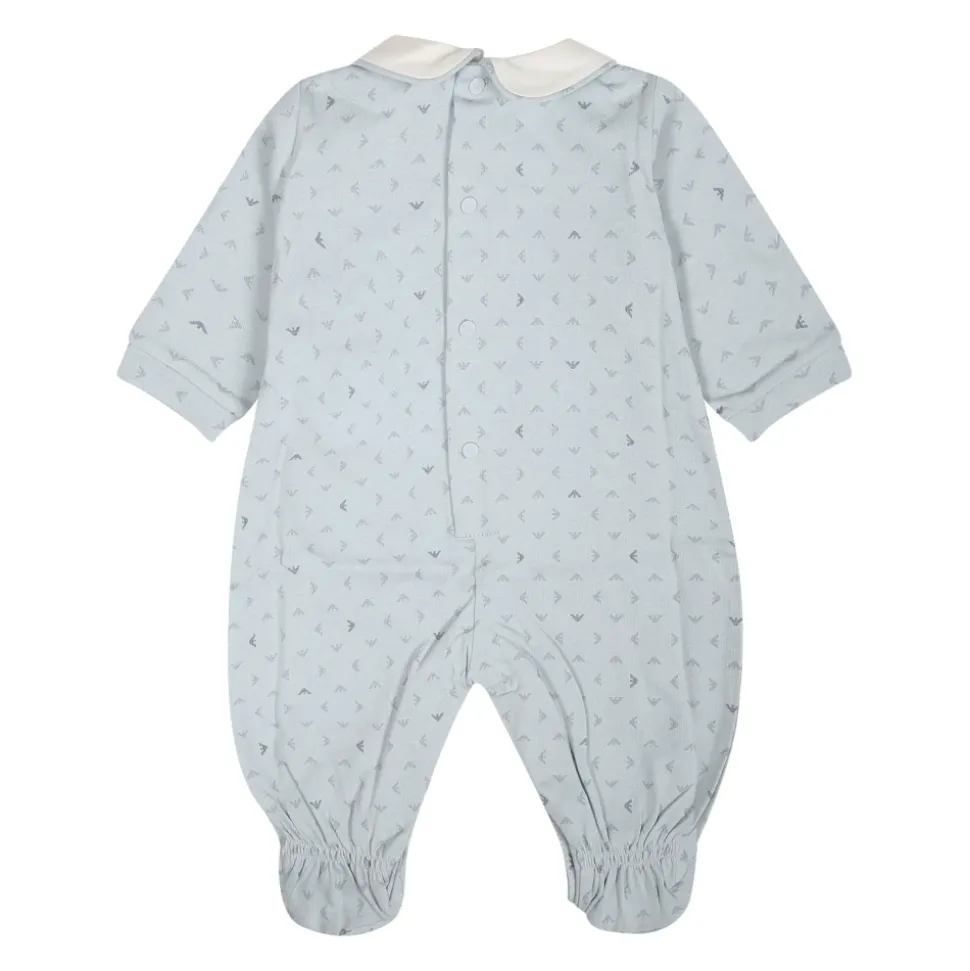 Kleed je kleintje in stijl met deze lichtblauwe katoenen playsuit van Emporio Armani. Met lange mouwen, een peter pan-kraag, voetjes, drukknoopsluiting op de rug en tussen de benen, en een allover adelaarslogo. Gemaakt van 100% katoen. Machinewas op 30°C.
