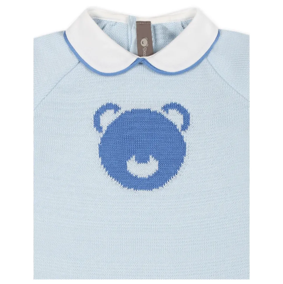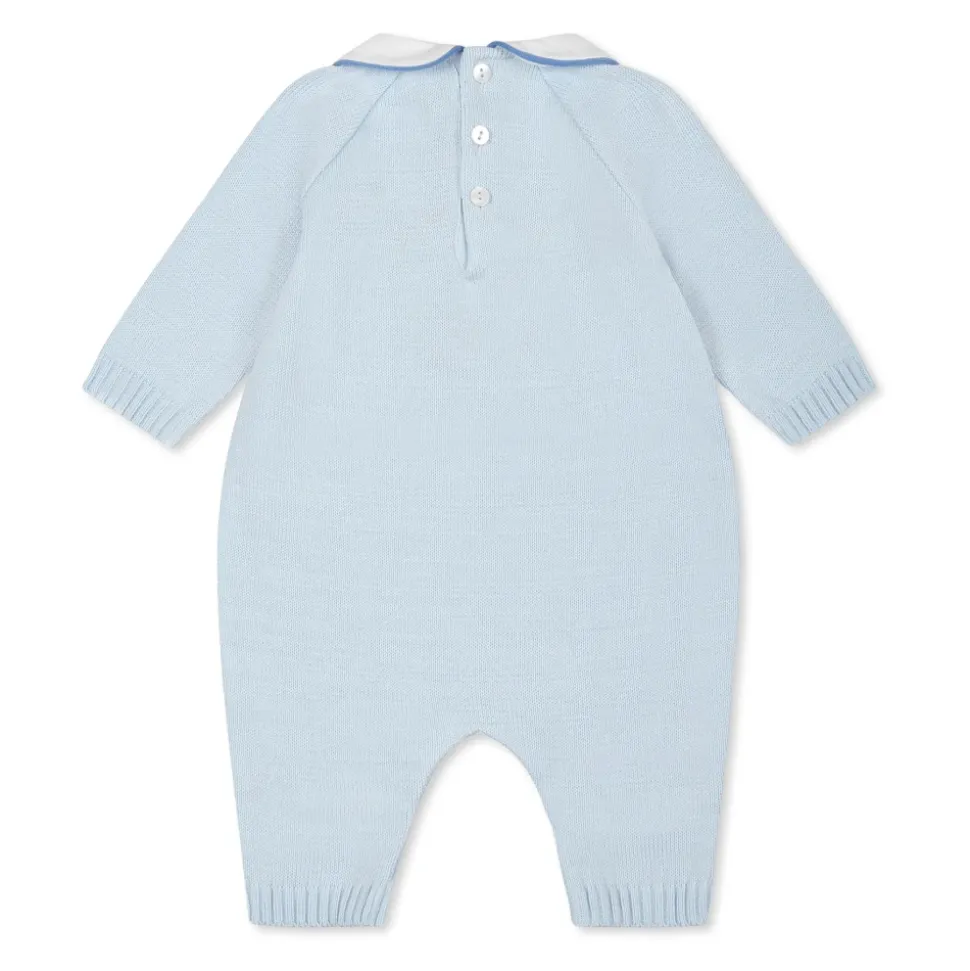 Kleed je kleintje in stijl met deze lichtblauwe katoenen romper van Little Bear. Met lange mouwen, een witte peter pan-kraag, parelmoer knopen, geribbelde manchetten en enkels, en een schattige blauwe beer op de voorkant. Gemaakt in Italië. 100% katoen. Alleen handwas.