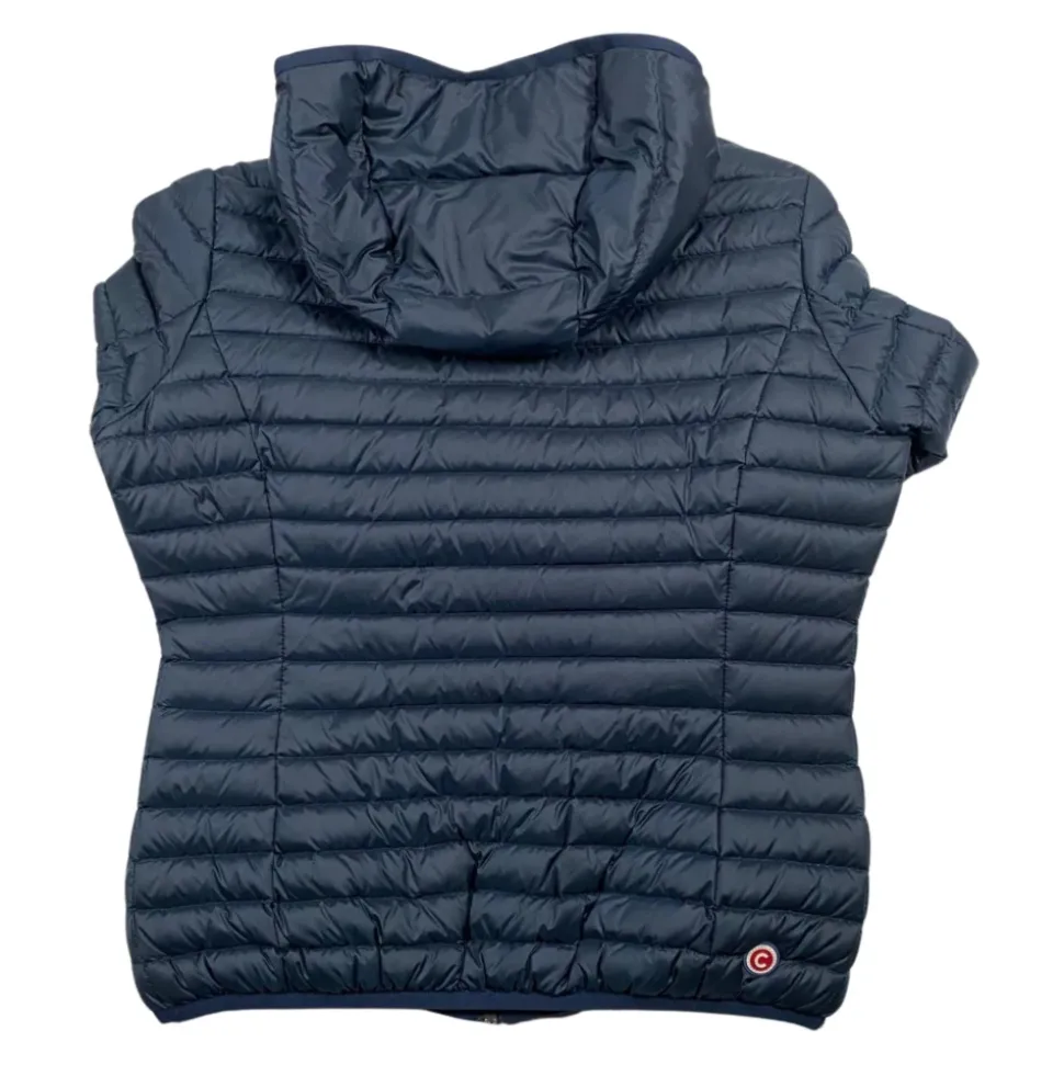 Colmar Kids blauwe jas met blauwe voering met contrast, ritssluiting, zijzakken met rits, vaste capuchon, elastisch tape aan zoom en manchetten, gemaakt van 100% nylon buitenstof en gevuld met 90% eendendons en 10% eendenveren, waterafstotende behandeling, logo op de linker mouw.