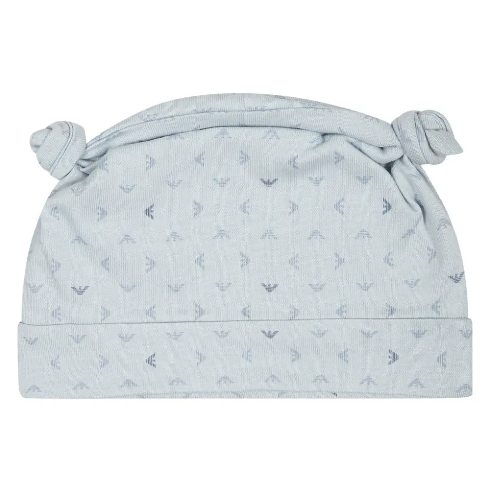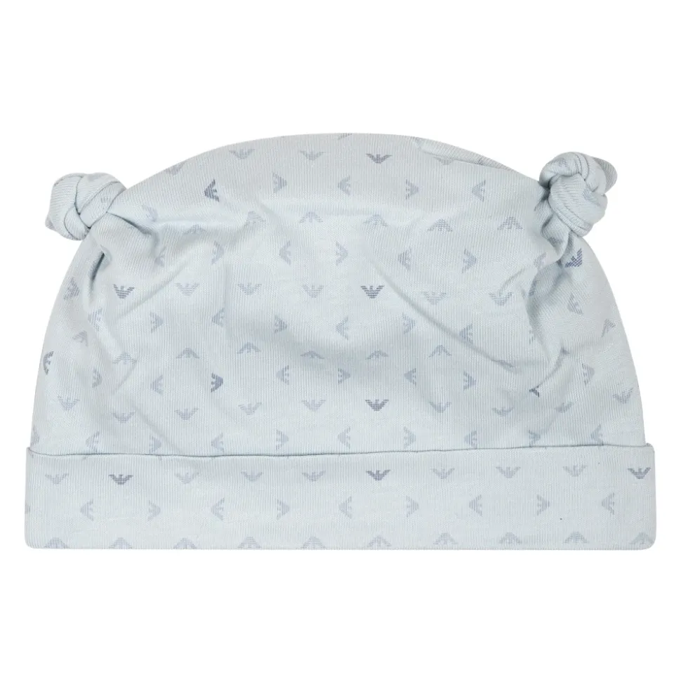 Emporio Armani Kids Lichtblauwe Katoenen Hoed met Manchet, Revers, Iconisch All-Over Adelaarslogo en Zijknopen. Wassen op 30°C.