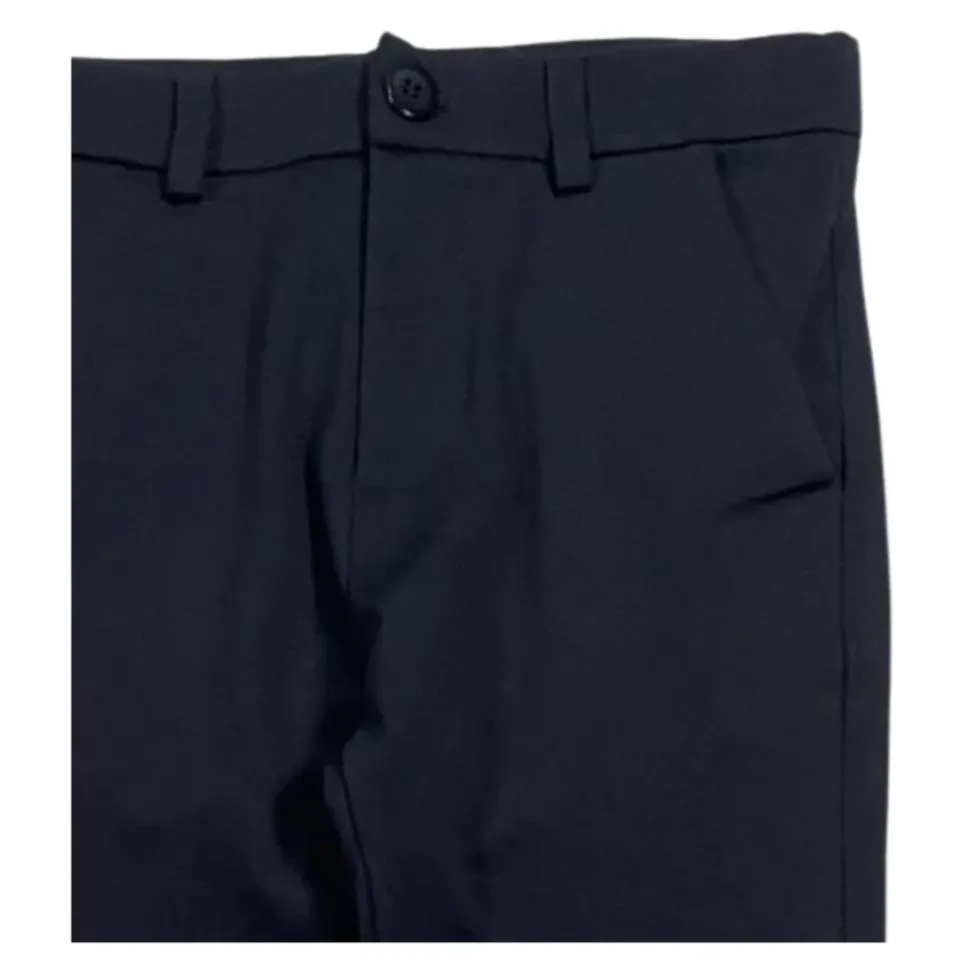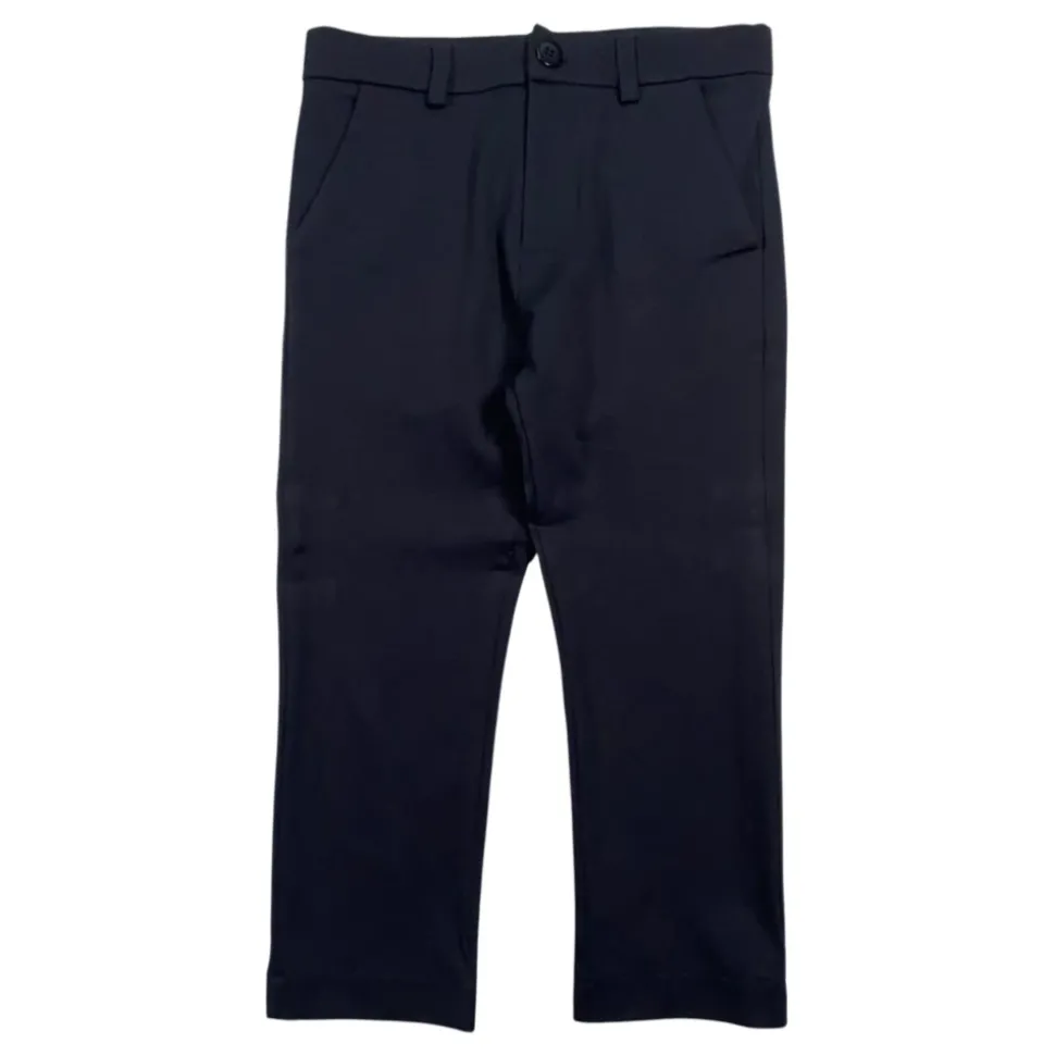 Manuel Ritz Kids blauwe broek, normale taille met riemlussen, twee zijzakken, een gleufzak aan de achterkant, rechte snit, normale pasvorm. Gemaakt in Italië van 52% katoen 40% polyamide 8% elastaan.