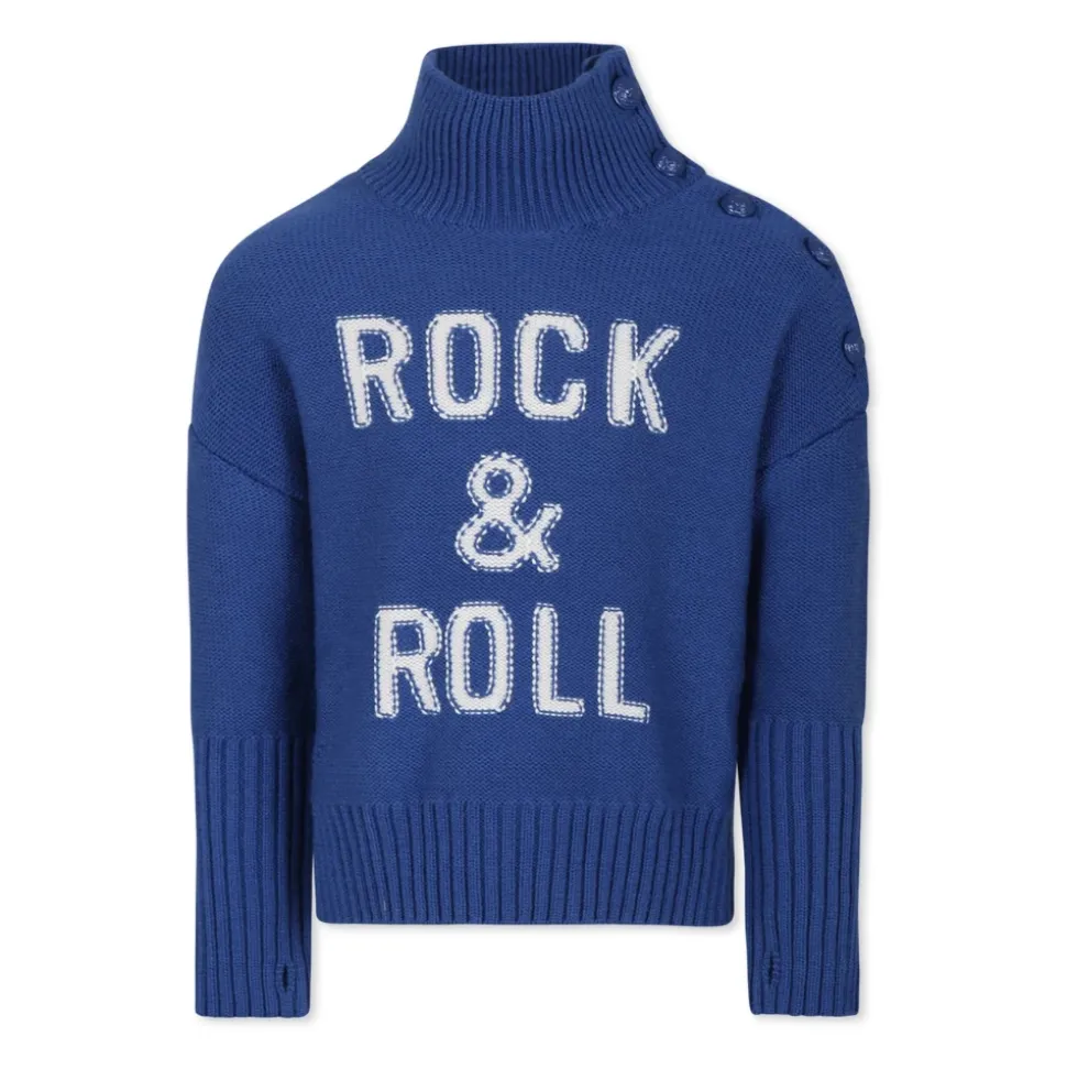 Upgrade de stijl van je kleintje met deze blauwe gebreide trui van Zadig & Voltaire. Met een opstaande kraag, knoopsluiting op de schouder en ‘Rock & Roll’ intarsia schrijven in het wit op de voorkant, is deze trui perfect om een vleugje stoerheid aan hun garderobe toe te voegen. Gemaakt van 65% wol en 35% polyamide, biedt het zowel stijl als comfort. Machinewasbaar op 30°C.