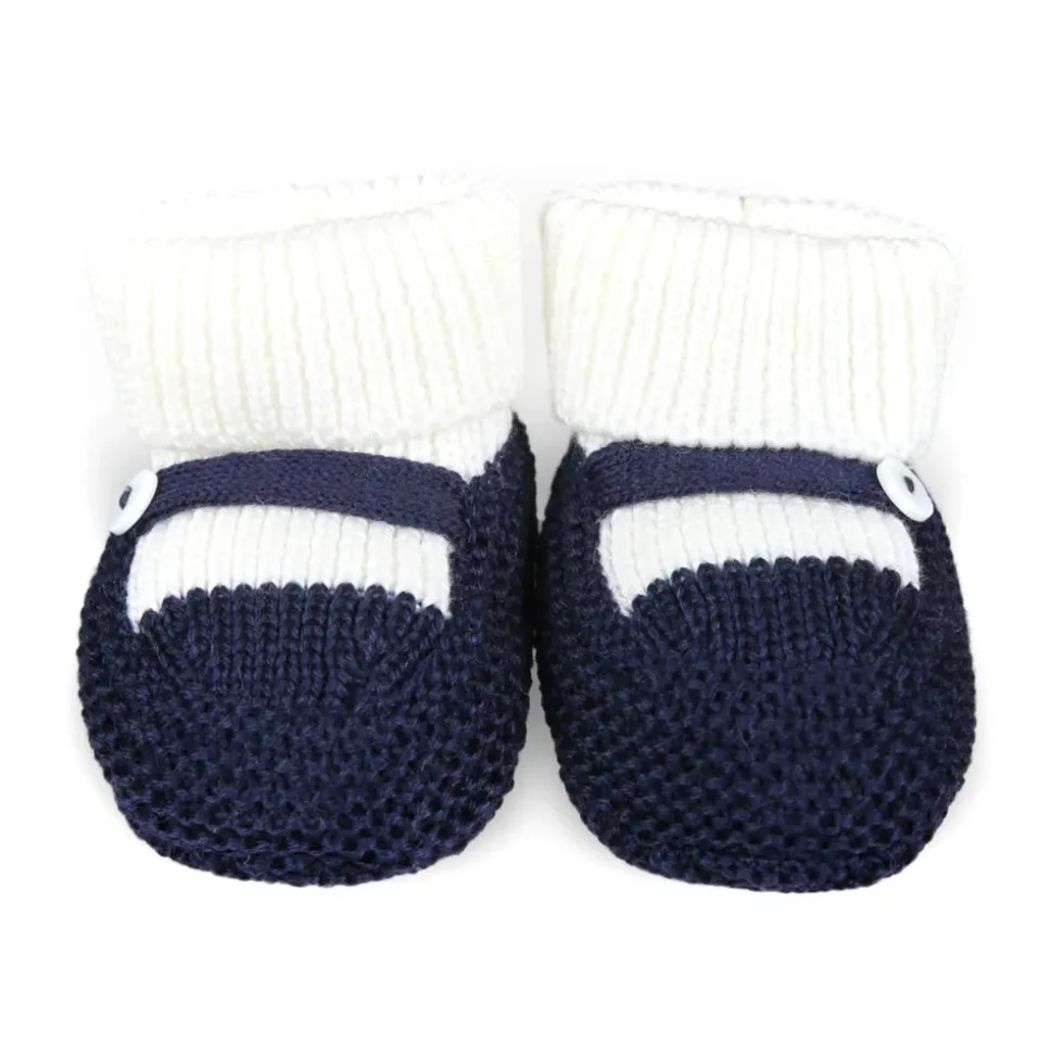 Blijf gezellig en stijlvol met deze witte en blauwe wollen pantoffels van Little Bear. Met revers, band en een moeder-van-parel knoop.