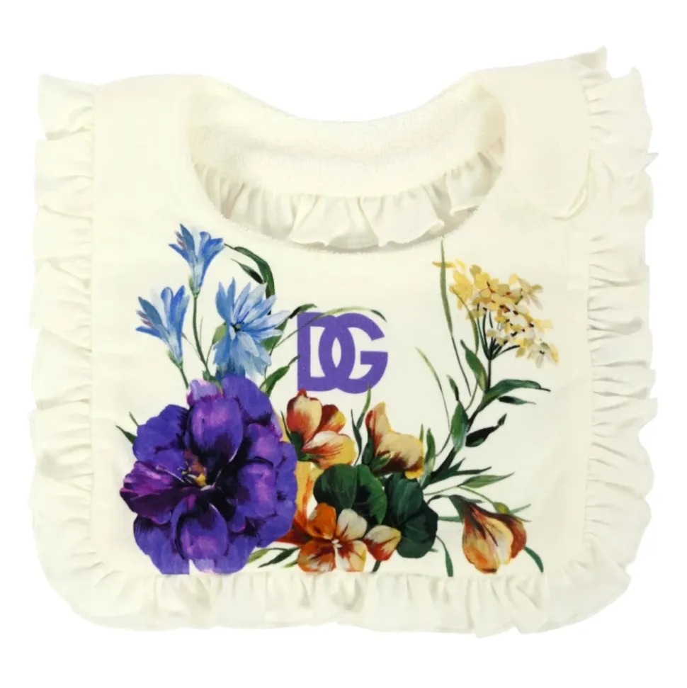 Kleed je kleintje in luxe met deze Ivory babygrow set van Dolce & Gabbana Kids. Gemaakt van zacht katoenen jersey, deze set bevat een romper, muts en slab. De romper heeft lange mouwen, gerimpelde ronde hals, drukknoopsluiting, elastische voeten en manchetten. De muts en slab hebben ook charmante details. Versierd met een bloemenprint in paars en oranje, en een paarse DG-logo, is deze set gemaakt in Italië van 100% katoen. Machinewasbaar op 30°C.