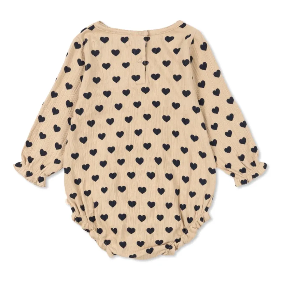 GEPATRONEERDE BODYSUIT van Konges Sløjd is het toonbeeld van verfijnde eenvoud en comfort, ontworpen met de jongsten in gedachten. Een subtiele beige tint, versterkt door een regelmatig motief van donker marineblauwe harten, geeft het stuk uitzonderlijke charme, terwijl de ruime, licht opgeblazen silhouet zorgt voor bewegingsvrijheid elke dag. Elegant geribbeld breisel is zacht, ademend en zacht voor de gevoelige huid van een baby. Een delicate afwerking met een kanten accent rond de halslijn en prachtige gerimpelde plooien afgewerkt met ruches bij de mouwen en beenopeningen voegen een duidelijk exclusief karakter toe aan de bodysuit. De productie is gebaseerd op premium katoenvezels met een GOTS-certificaat, waarbij de nadruk ligt op milieuzorg. Opmerkelijke afwerkingsprecisie en originele stijl onderscheiden elk ontwerp van het Deense merk. WAAROM DIT PRODUCT KIEZEN? * Uitzonderlijke kwaliteit die het comfort van uw kind waarborgt * Uniek, tijdloos patroon en exclusieve details * Huidvriendelijk en milieubewust materiaal * Functionele, comfortabele snit met prachtige afwerking