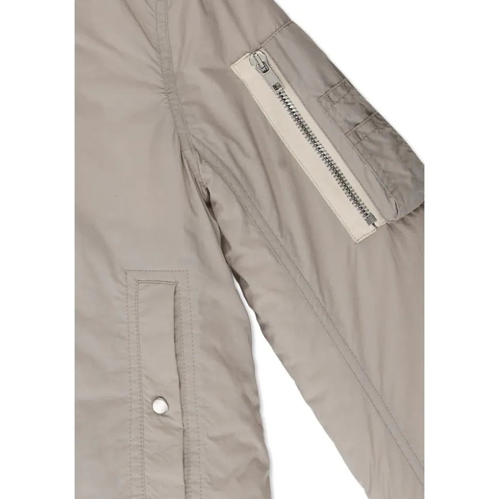 BOMBERJACK uit de Rick Owens Kids-collectie trekt de aandacht met zijn verfijnde minimalisme en moderne karakter, perfect in lijn met de smaak van een jonge modekenner. Het klassieke, cropped model met een zacht afgeronde zoom en getailleerde pasvorm, bereikt door elastische gebreide ribbels, accentueert de silhouet en biedt elegantie voor dagelijks gebruik. De buitenlaag, vervaardigd uit hoogwaardig nylon, straalt lichtheid en duurzaamheid uit, terwijl wollen details een vleugje exclusiviteit toevoegen. De jas betovert met zijn gladde oppervlak en de sobere afwerking benadrukt zijn verfijnde eenvoud. Hij valt op door precies geplaatste TWEE VOORFLAPZAKKEN die gesloten zijn met elegante metalen drukknopen, en een stevige rits met contrasterende afwerking, die samen harmonieus het unieke karakter completeren. WAAROM DIT PRODUCT KOPEN? * Gemaakt van en nobele materialen * Tijdloos, minimalistisch ontwerp * Uitzonderlijk draagcomfort dankzij elastische afwerking * Praktische en veilige zakken * Handtekening van een prestigieuze ontwerper