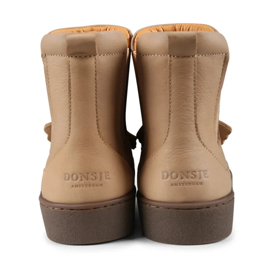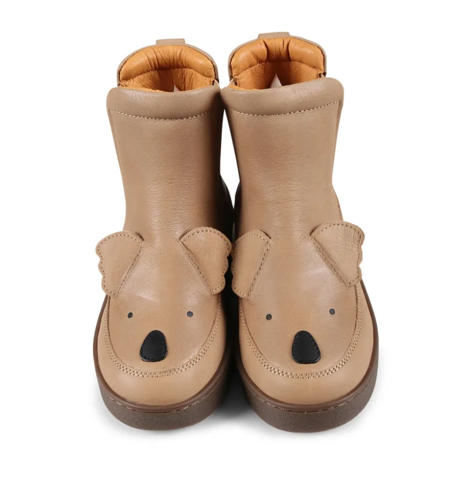 Donsje bruine leren enkellaarsjes voor kinderen, handgemaakt met rubberen zool, zijelastiek en schattige koala-oren aan de voorkant. Met het merklogo op de achterkant. Gemaakt van 100% leer.