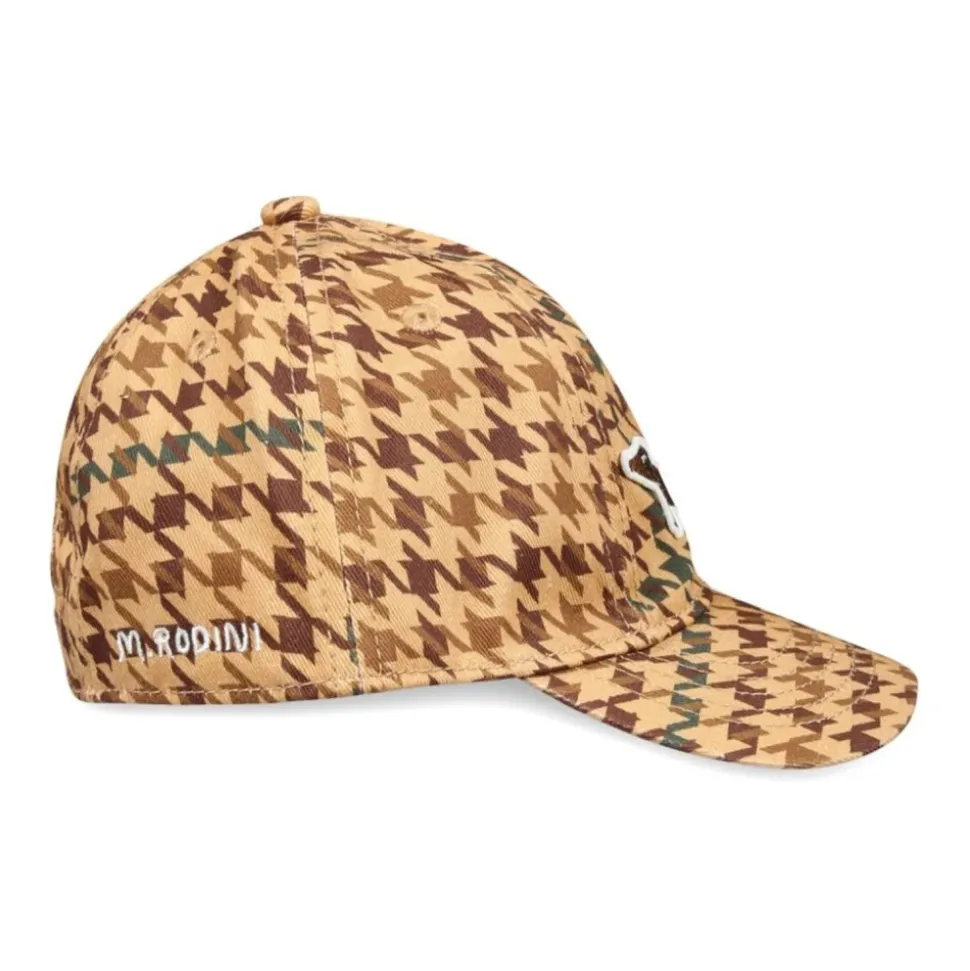 Lichtbruine hondenapplicatiepet van Mini Rodini. Gemaakt van katoenen keperstof met verstelbare band, pied-de-poule print, stofbedekte knoop, ronde kroon, applicatiedetail, geborduurd logo en gebogen klep.