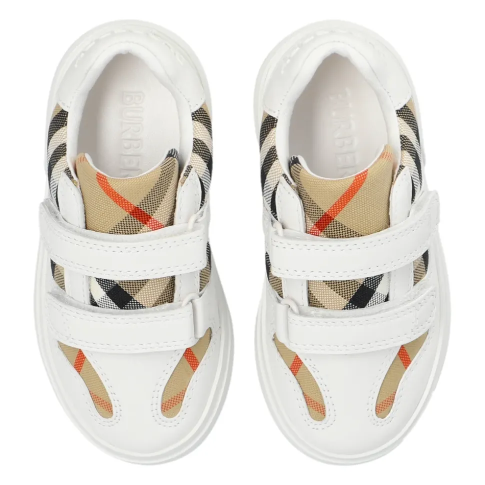 De Burberry Check en leren sneakers combineren het kenmerkende ruitmotief van het merk met een praktisch klittenbandontwerp voor gemakkelijk dragen. Deze sneakers combineren een bovenwerk van leer en katoen met een stabiele rubberen zool voor dagelijks gebruik. Belangrijkste kenmerken: Wit | Leer | constructie | Stabiele grip op diverse oppervlakken | Drievoudige klittenbandsluiting voor gemakkelijk aan- en uittrekken | Platte rubberen zool voor stabiliteit | Ruitpatroon | Designerlogo op achterpaneel | Samenhangend interieurontwerp | Afmetingen & pasvorm: Afmetingen: Zoolhoogte: 2,5 cm | Samenstelling & onderhoud: Bovenkant: 50% kalfsleer, 50% katoen | Voering: 70% katoen, 30% schapenleer | Zool: 100% rubber