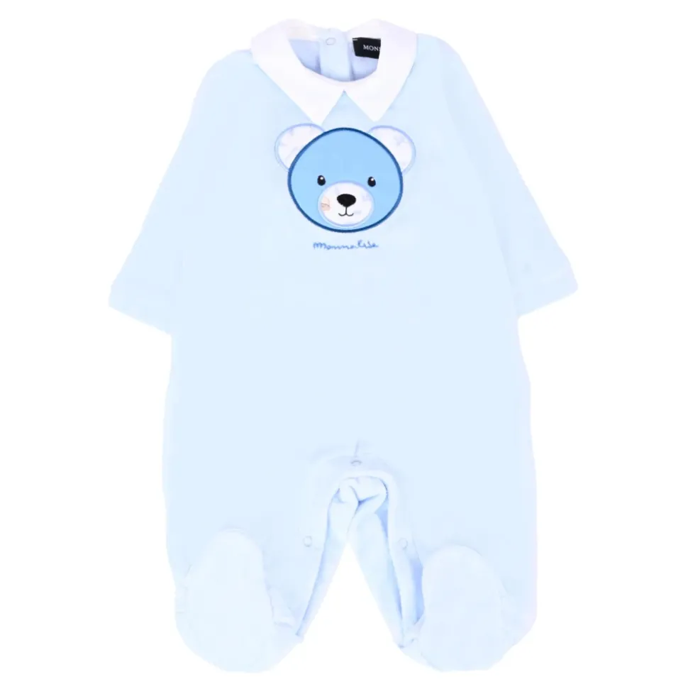 Kleed je kleintje in stijl met deze lichtblauwe chenille boxpak van Monnalisa. Met lange mouwen, een witte puntkraag, voetjes, drukknoopsluiting op de rug en tussen de benen, en een geborduurde beer en logo op de voorkant. Gemaakt van 100% katoen. Machinewas op 30°C.