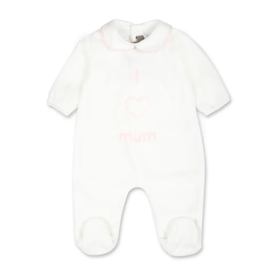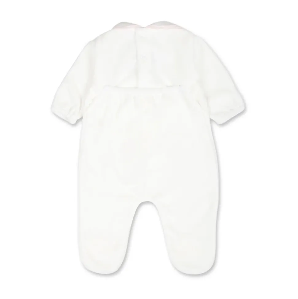 Kleed je kleintje in stijl met deze witte chenille boxpak van Little Bear. Met lange mouwen, een peter pan kraag met roze details, drukknoopsluiting op de rug en elastische voeten en manchetten. Versierd met een hart en ‘Mum’ borduursel op de voorkant. Gemaakt in Italië van 80% katoen en 20% polyamide. Alleen handwas.