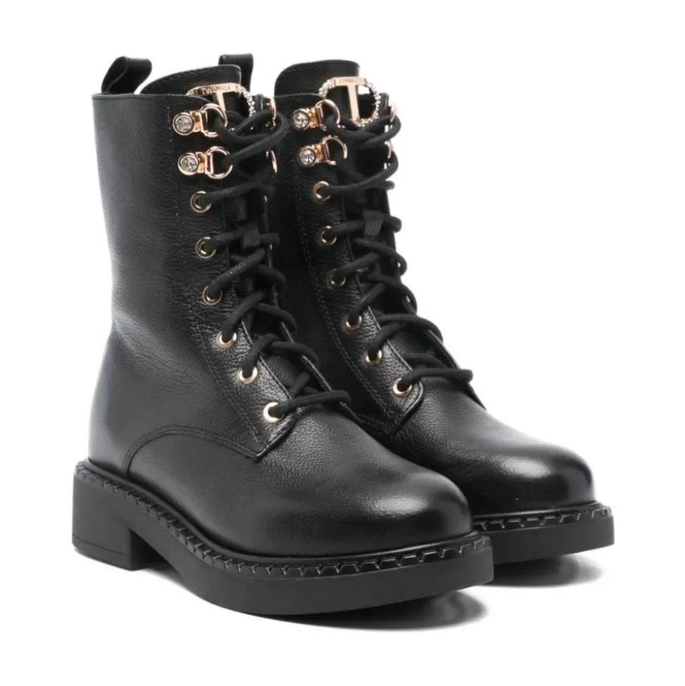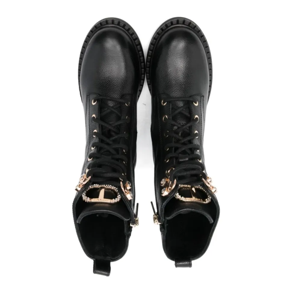 TWINSET Combatlaarzen met Strass Ovaal T combineren een stoer combat silhouet met een kenmerkend strass Ovaal T detail. Deze laarzen zijn ontworpen voor dagelijks gebruik en combineren een verhoogd decoratief logo met een praktische rubberen zool. Belangrijkste kenmerken: Zwart | Polyurethaan | Rubberen zool | Voering van schapenvacht | Strass Ovaal T logo detail | Combatlaars silhouet | Lage blokhak | Afmetingen & pasvorm: Zoolhoogte 4 cm | Samenstelling & onderhoud: 100% polyurethaan | 100% schapenvacht | 100% rubber (zool) | Niet wassen. Niet bleken. Niet in de droogtrommel. Niet strijken. Niet chemisch reinigen.