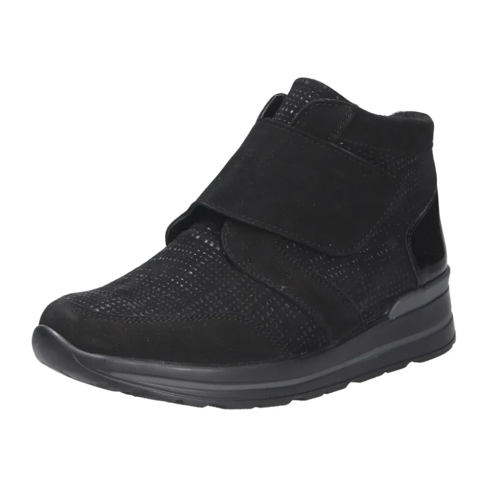 Deze veelzijdige laarzen bieden warmte en comfort, perfect voor wie op zoek is naar een stijlvolle maar praktische schoenoptie. Belangrijkste kenmerken: Zwart | Hoogwaardig synthetisch materiaal | Slijtvaste zool | Vervangbare binnenzool | Klittenbandsluitingen | Vierkant ontwerp | Brede schachtwijdte | Afmetingen en pasvorm: Valt normaal qua maat | Comfortwijdte M | Samenstelling en onderhoud: Reinig met een vochtige doek