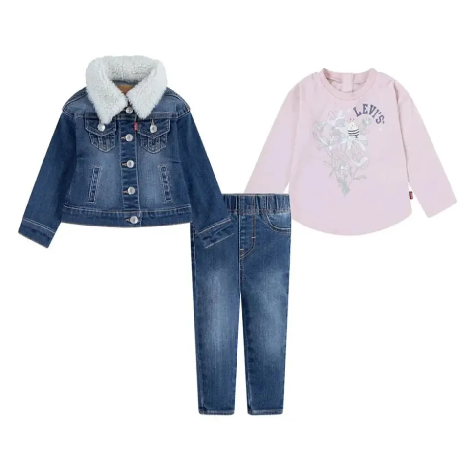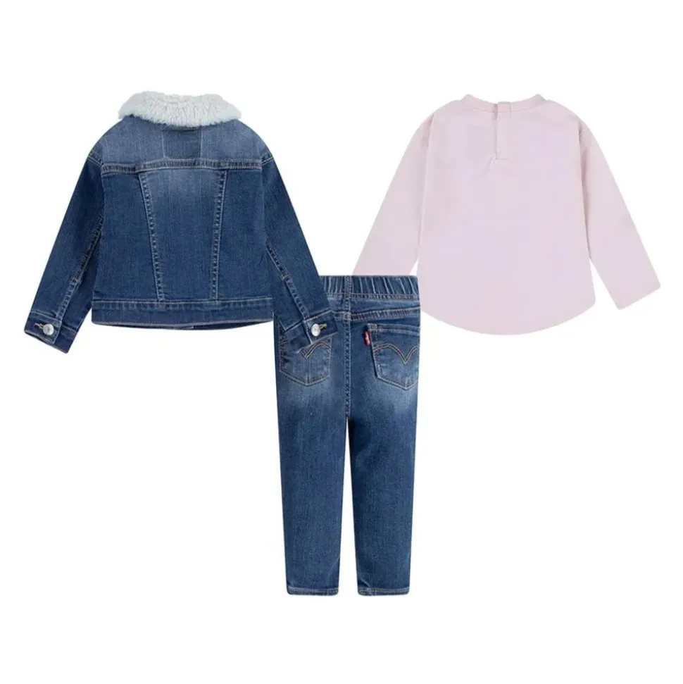 Levi’s Completo Sportivo combineert een denim jack met een top met lange mouwen en jeans met elastische tailleband voor een gemakkelijke, comfortabele dagelijkse outfit. De set is gericht op praktische details voor eenvoudig aankleden en bewegingsvrijheid. Belangrijkste kenmerken: Multicolor | Rosa | Katoen-polyester mix | Comfortabele constructie | Bewegingsvrijheid | Knoopsluiting op jack | Elastische taille in jeans | Eenvoudige ronde halslijn op top | Denim jack | Lange mouwen | Ronde halslijn | Modern, functioneel ontwerp | Afmetingen & pasvorm: Uitstekende pasvorm | Comfortabele snit | Samenstelling & onderhoud: 60% Katoen | 40% Polyester | Niet chemisch reinigen. Niet in de droogtrommel. Niet bleken. Wassen met wasmiddel voor kleuren. Strijken op max. 110°C zonder stoom. Volg de instructies op het waslabel.